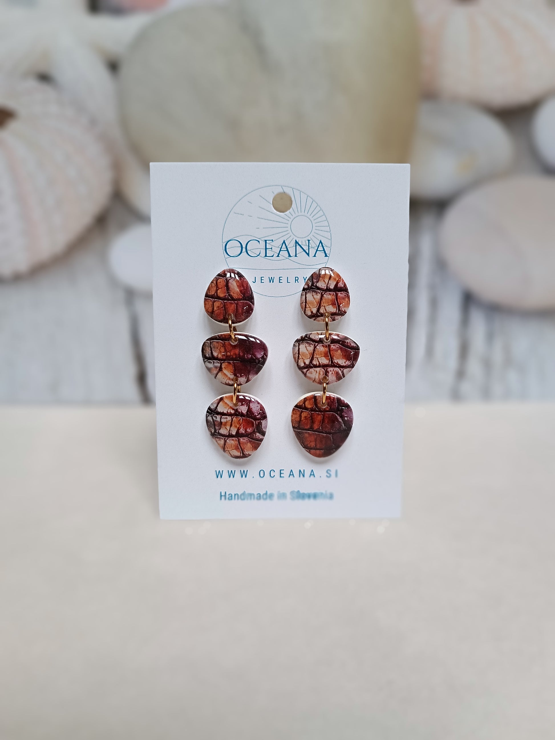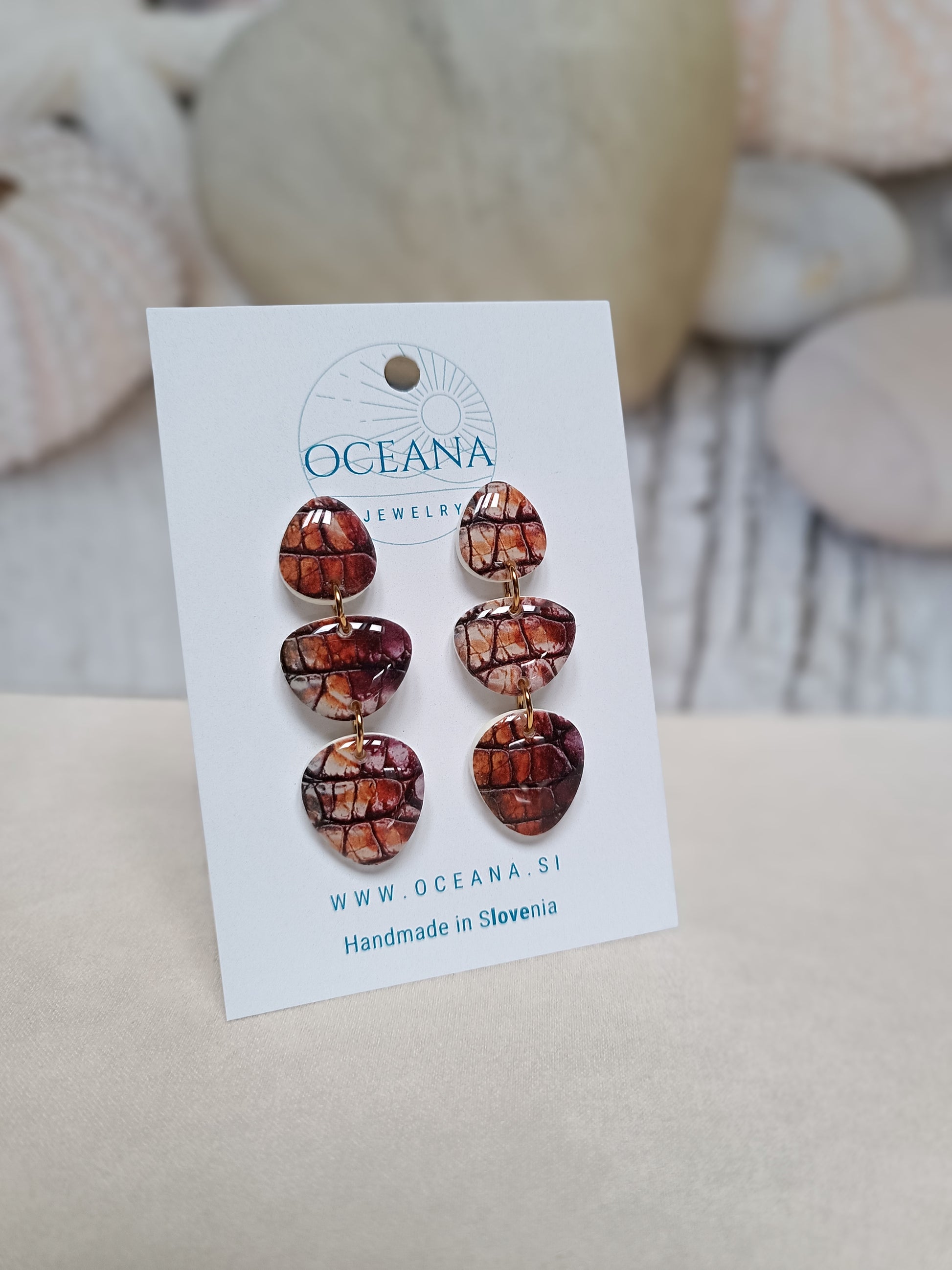 Dodaj svojemu videzu kanček divje elegance z ročno izdelanimi uhani iz polimerne gline. Vsak par je skrbno oblikovan in prekrit z bleščečo plastjo smole za gladek in obstojen izgled.