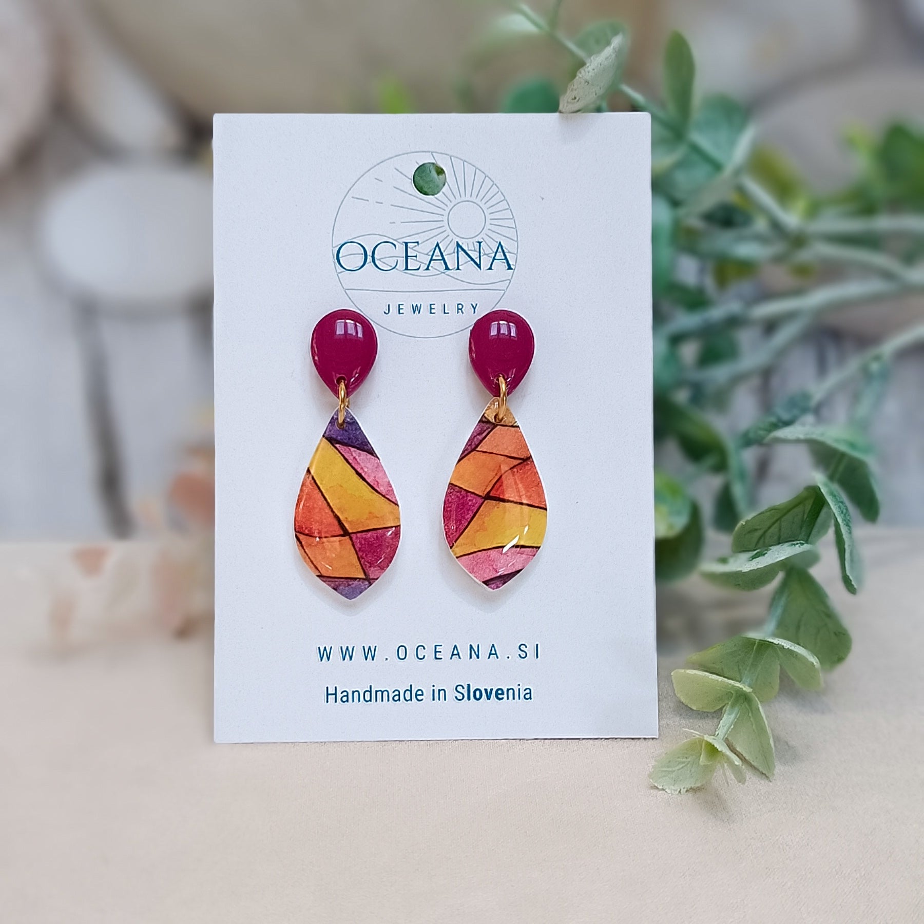 Dodaj kanček barve svojemu dnevu! Uhančki so izdelani iz kakovostne polimerne gline in so zelo lahki, preliti so s smolo, ki jim daje sijaj in večjo obstojnost. Zatič je iz kiruršekga jekla.