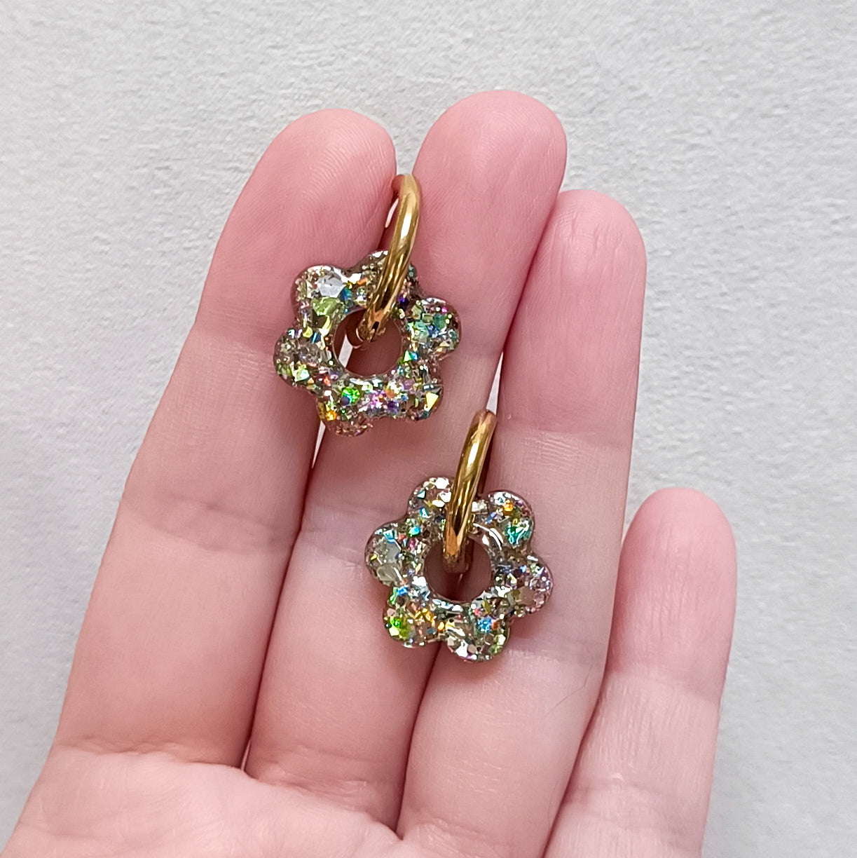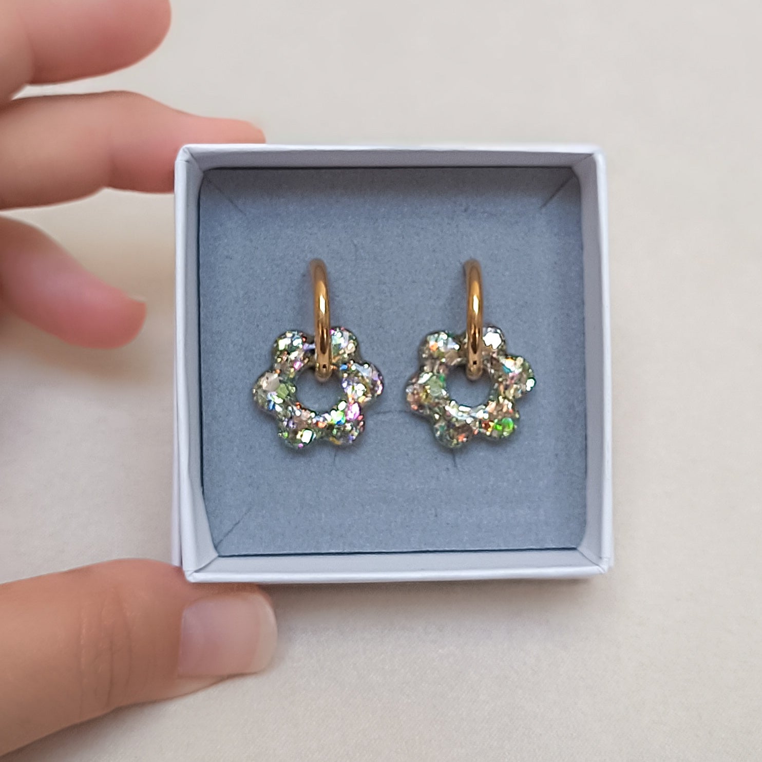 Ta kolekcija je polna zabavnik oblik, živahnih barv in neskončnega bleščanja. Vsak kos je ročno izdelan in epoksi smole in bleščic, majhno praznovanje, ki ga lahko nosiš vsak dan. Vesela, sijoča in polna dobre energije. Naj ti ta par polepša dan, da lahko zasiješ v vsakem trenutku.