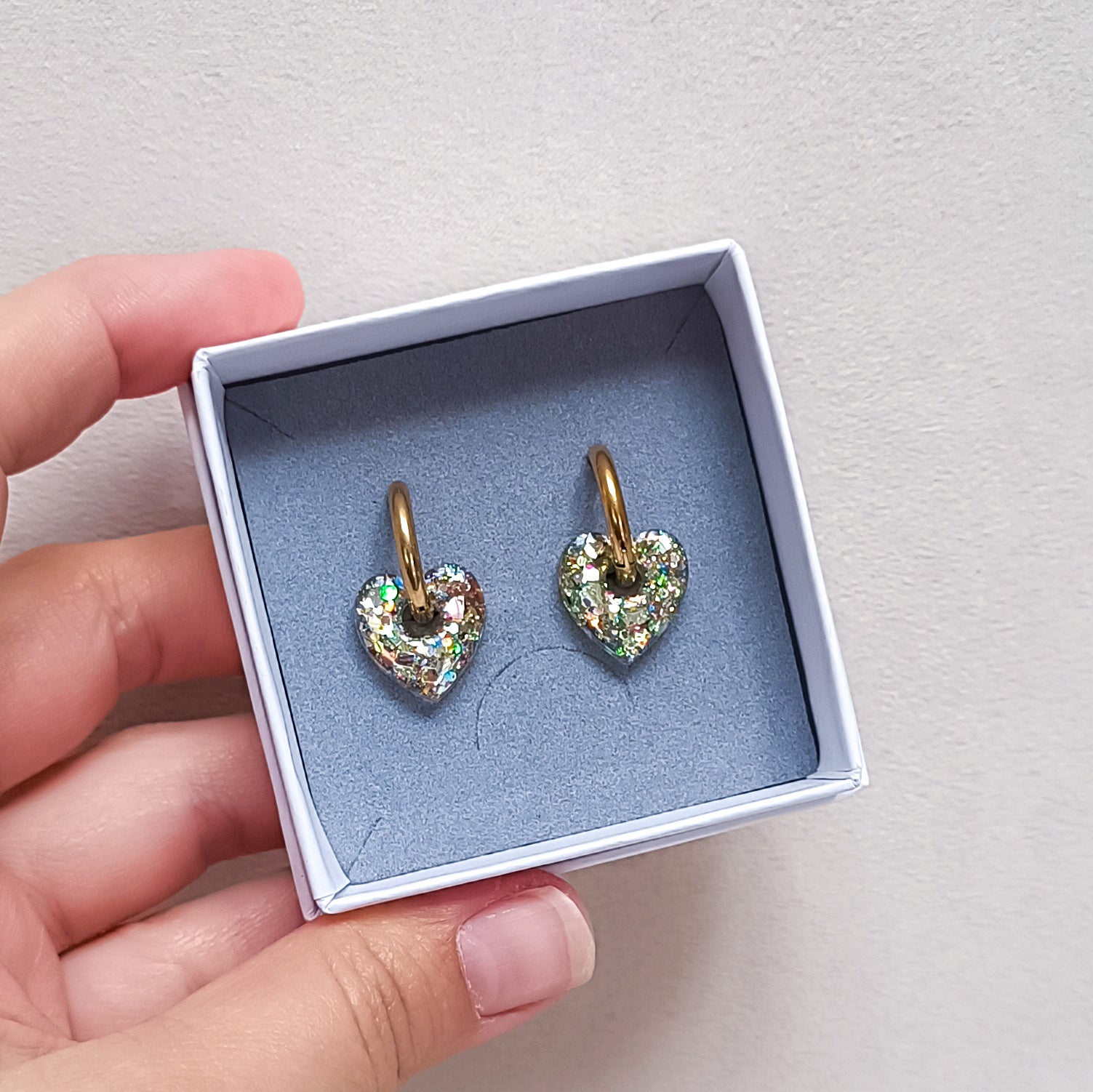 This is a collection full of sparkle, color and pure joy. Each piece is handmade with epoxy and touch of glitter magic, fun shapes, shiny detalis and happy vibes all around. Wear them when you want to shine a little brighter and feel good energy wherever you go. Posts are stainless steel.