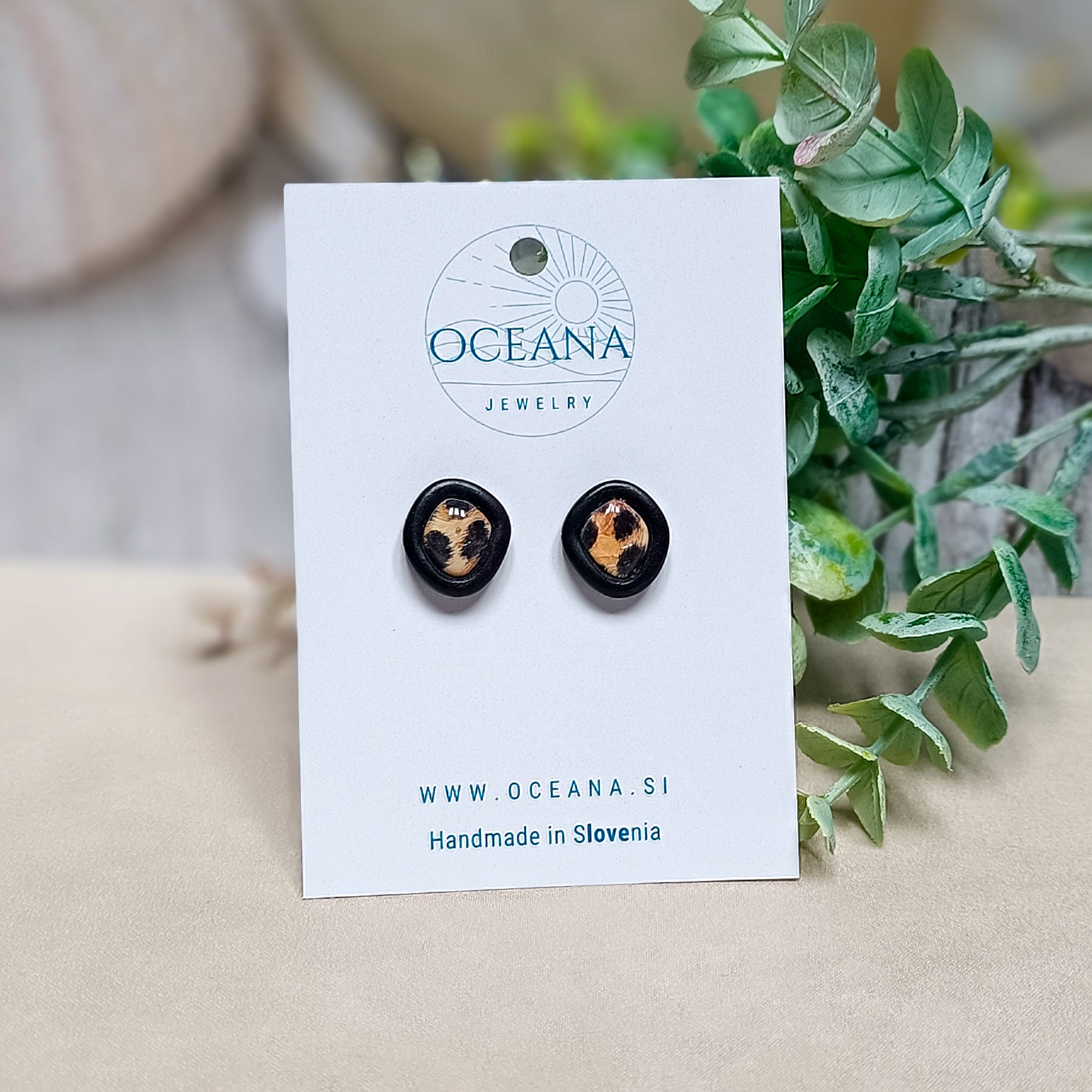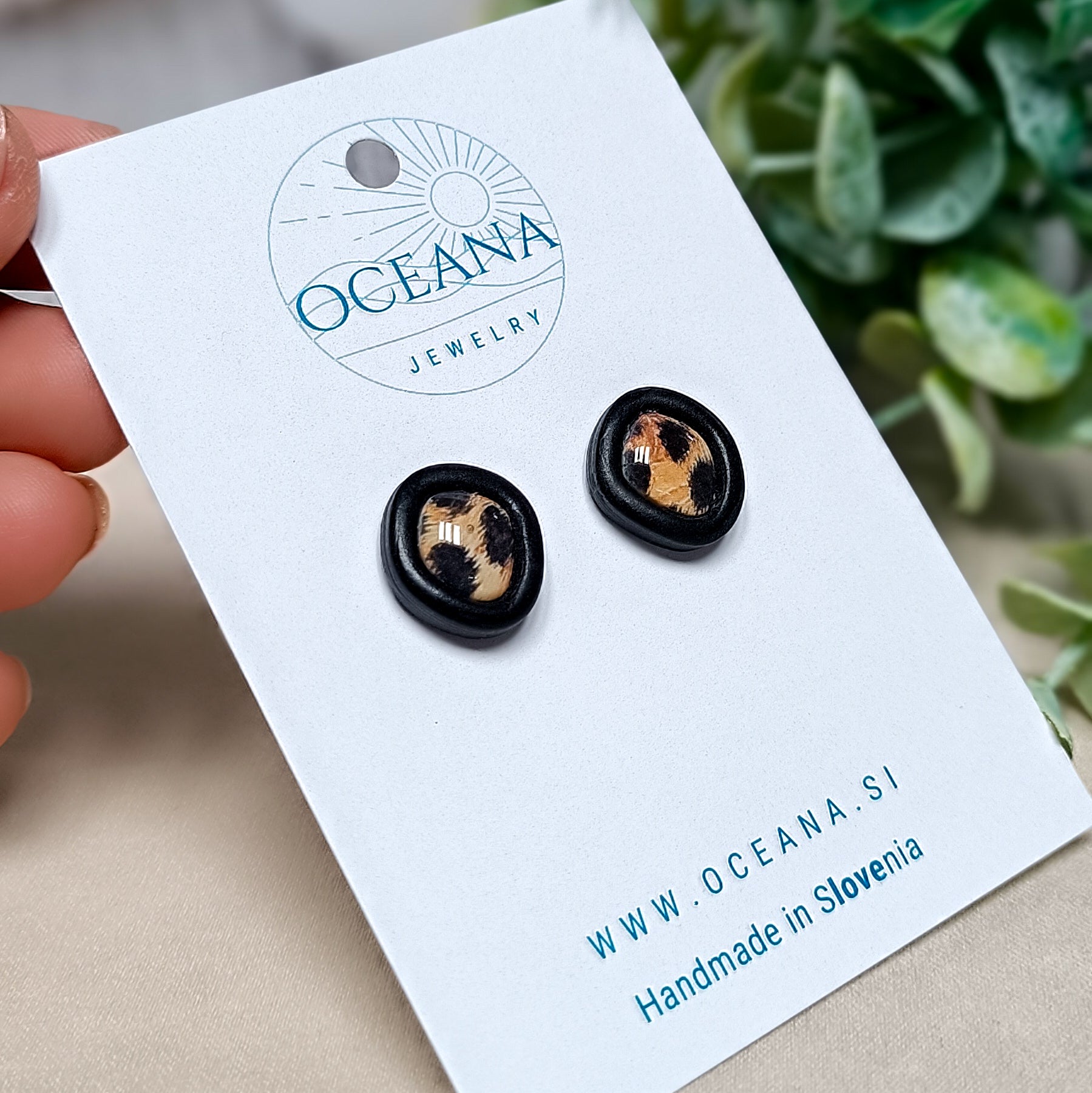 Dodaj svojemu videzu kanček divje elegance z ročno izdelanimi uhani iz polimerne gline. Vsak par je skrbno oblikovan in prekrit z bleščečo plastjo smole za gladek in obstojen izgled.