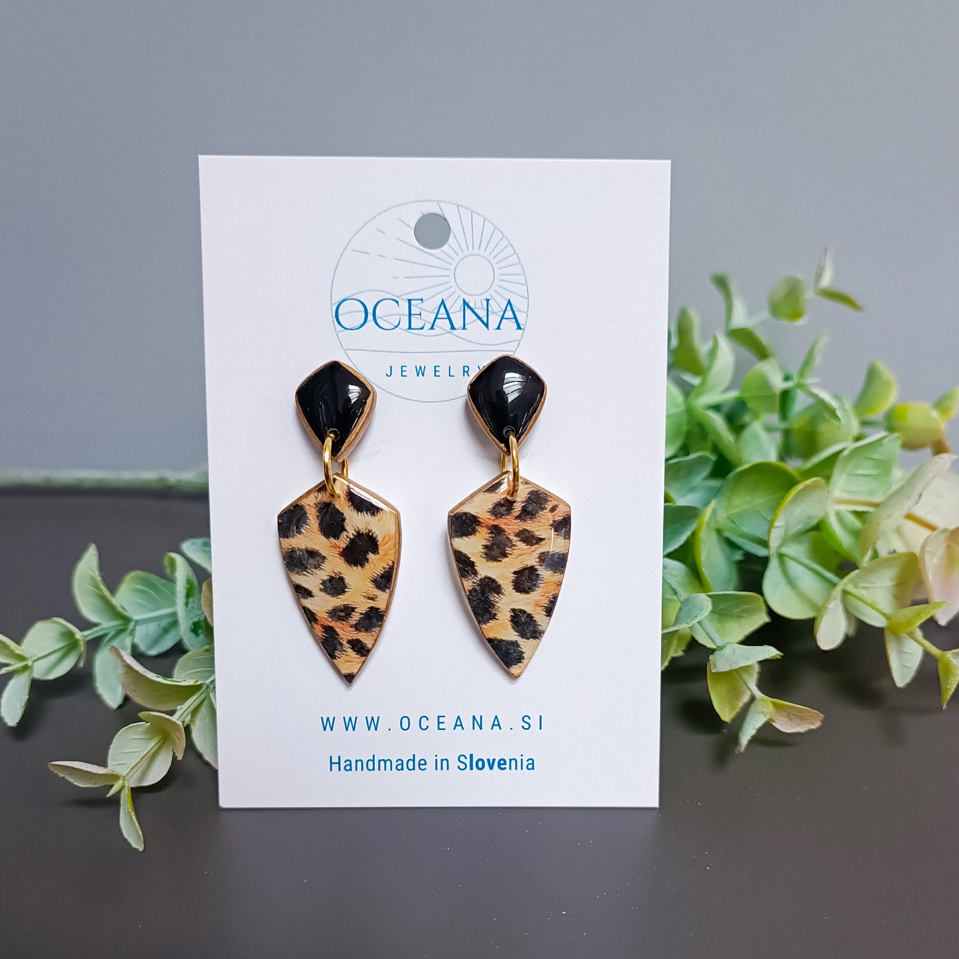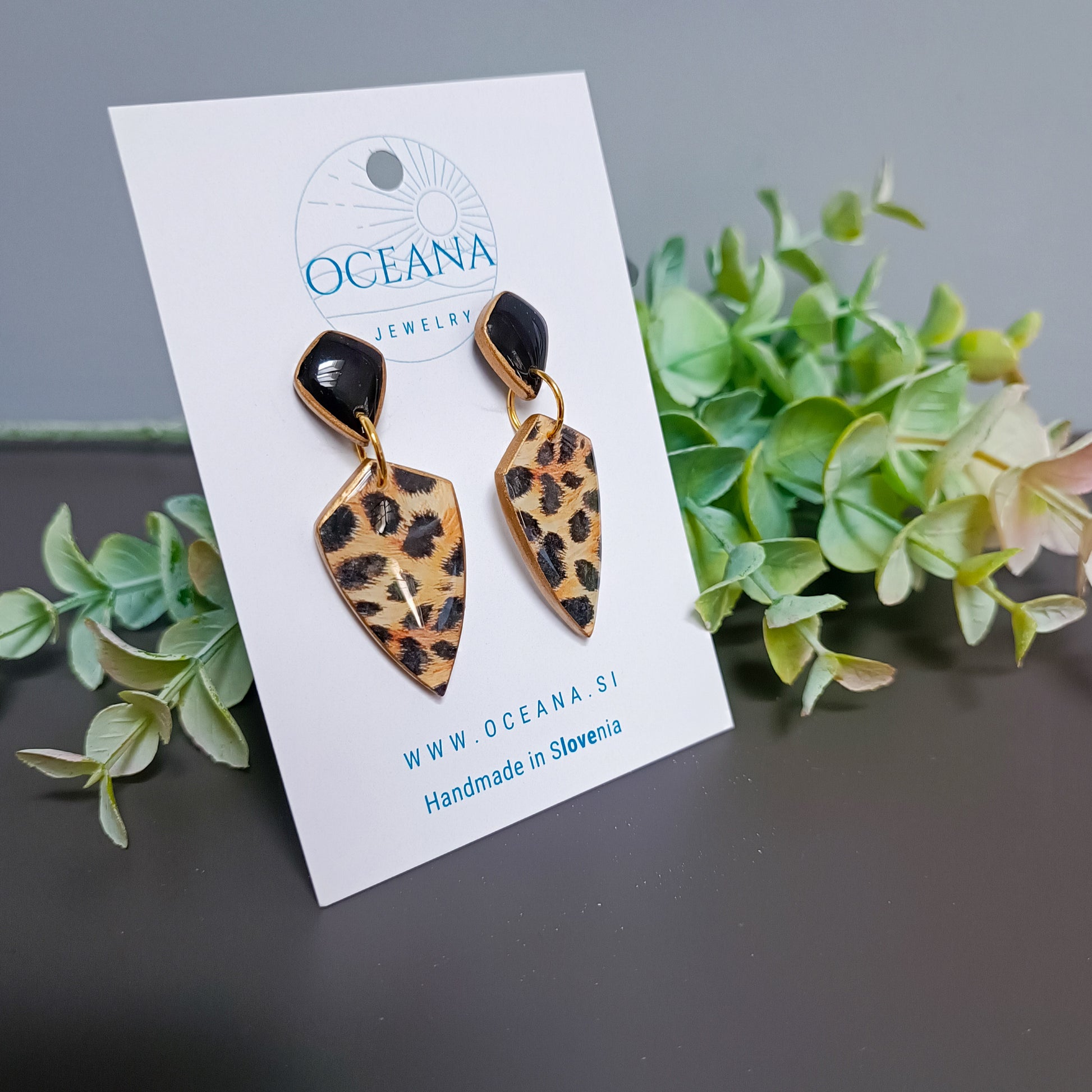 Dodaj svojemu videzu kanček divje elegance z ročno izdelanimi uhani iz polimerne gline. Vsak par je skrbno oblikovan in prekrit z bleščečo plastjo smole za gladek in obstojen izgled.