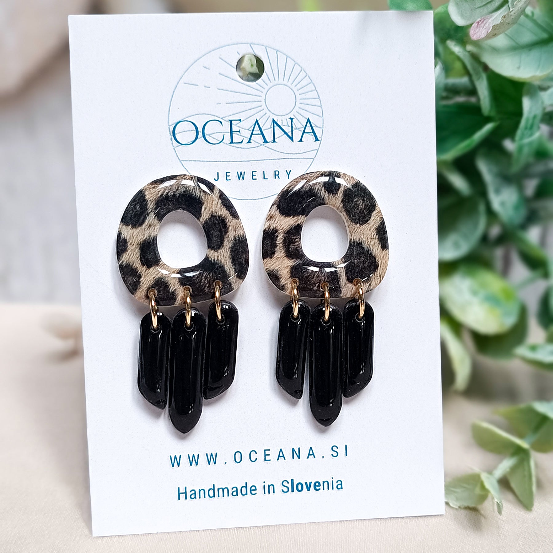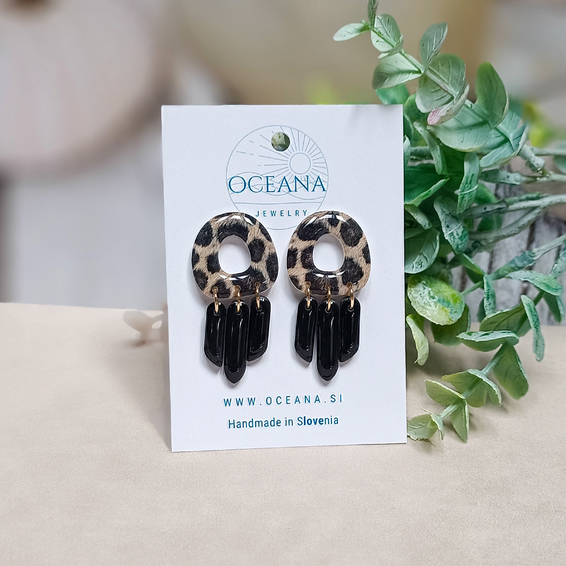 Dodaj svojemu videzu kanček divje elegance z ročno izdelanimi uhani iz polimerne gline. Vsak par je skrbno oblikovan in prekrit z bleščečo plastjo smole za gladek in obstojen izgled.