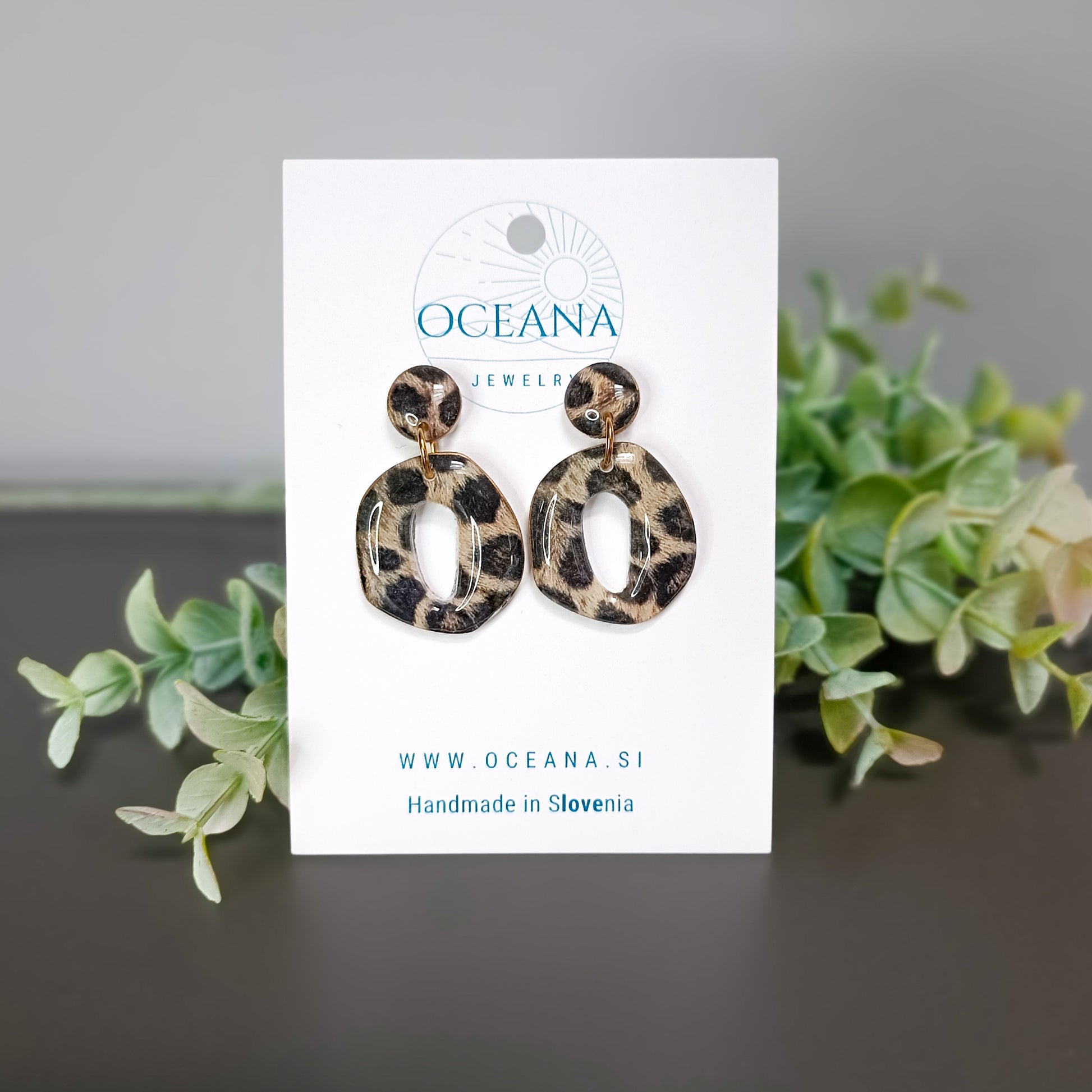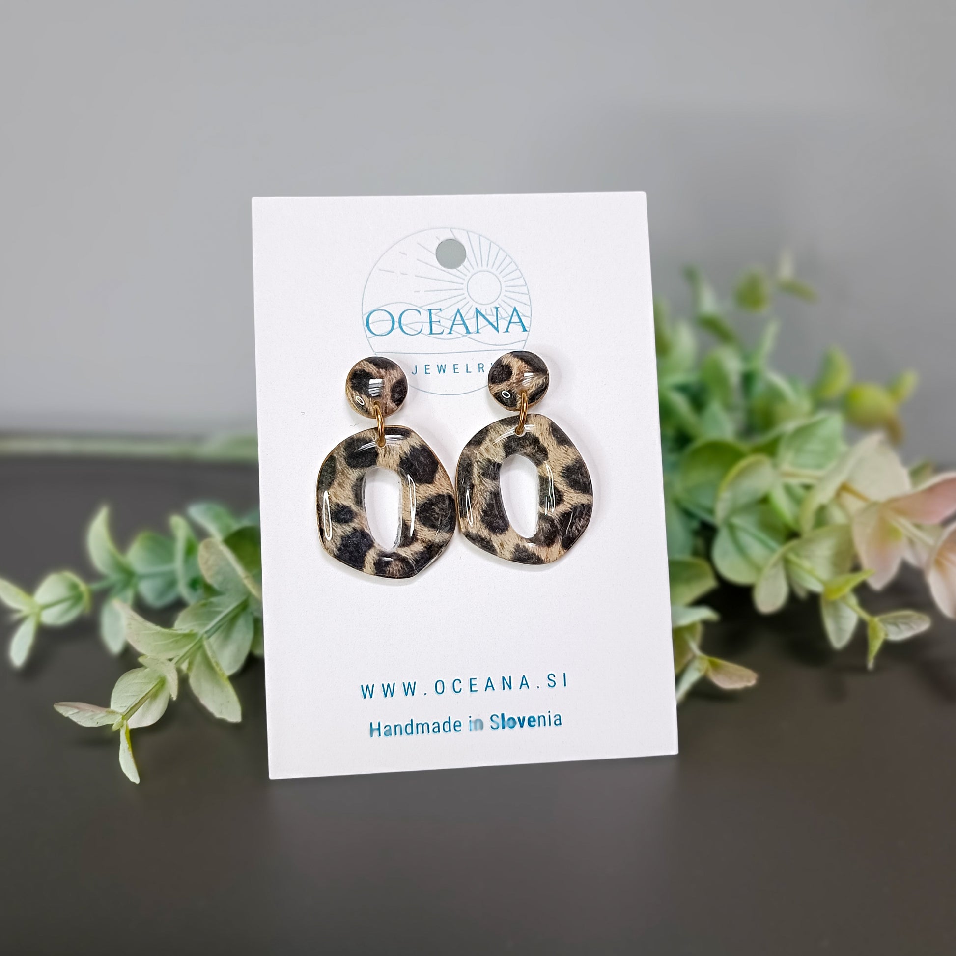 Dodaj svojemu videzu kanček divje elegance z ročno izdelanimi uhani iz polimerne gline. Vsak par je skrbno oblikovan in prekrit z bleščečo plastjo smole za gladek in obstojen izgled.