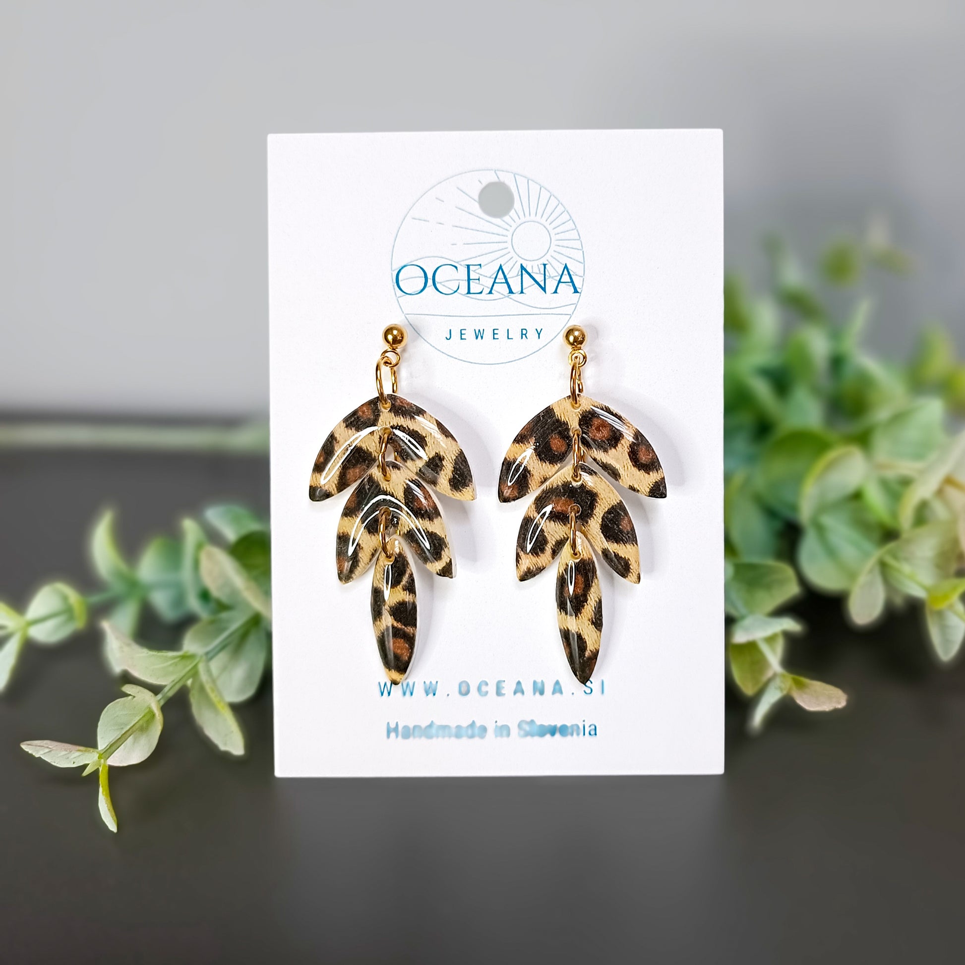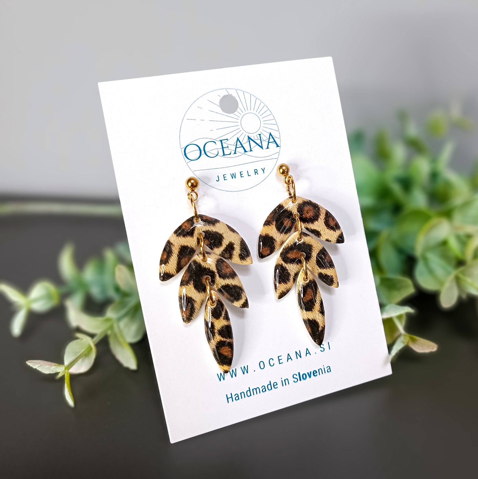 Dodaj svojemu videzu kanček divje elegance z ročno izdelanimi uhani iz polimerne gline. Vsak par je skrbno oblikovan in prekrit z bleščečo plastjo smole za gladek in obstojen izgled.