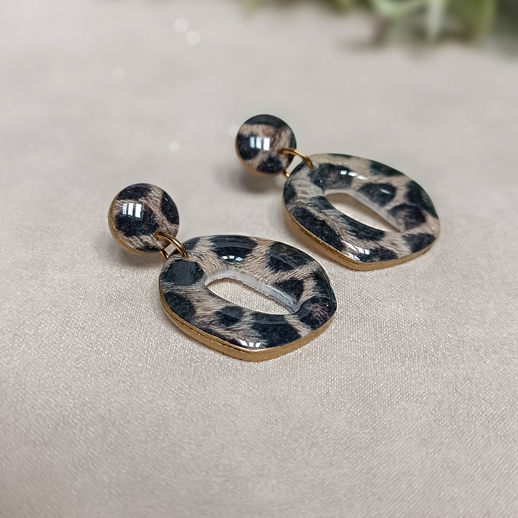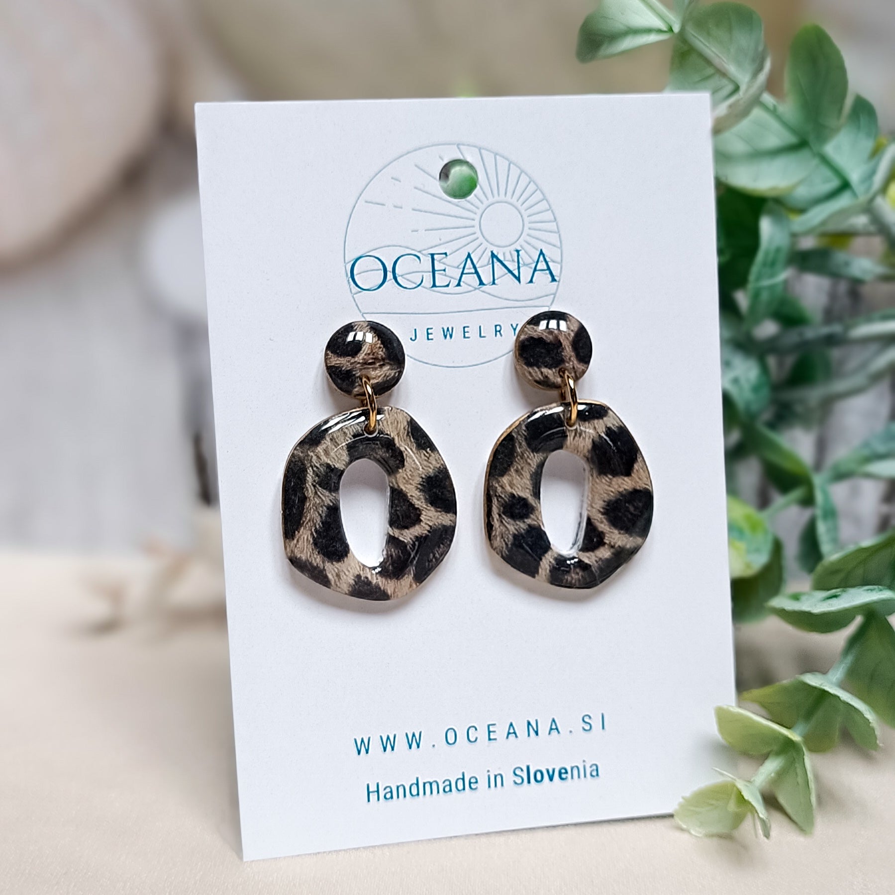 Dodaj svojemu videzu kanček divje elegance z ročno izdelanimi uhani iz polimerne gline. Vsak par je skrbno oblikovan in prekrit z bleščečo plastjo smole za gladek in obstojen izgled.