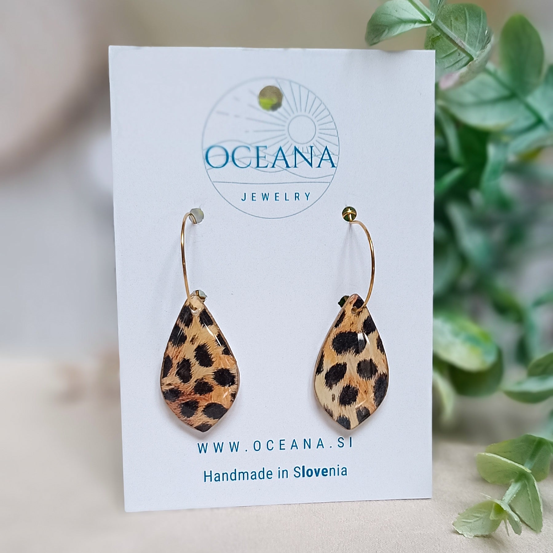 Dodaj svojemu videzu kanček divje elegance z ročno izdelanimi uhani iz polimerne gline. Vsak par je skrbno oblikovan in prekrit z bleščečo plastjo smole za gladek in obstojen izgled.