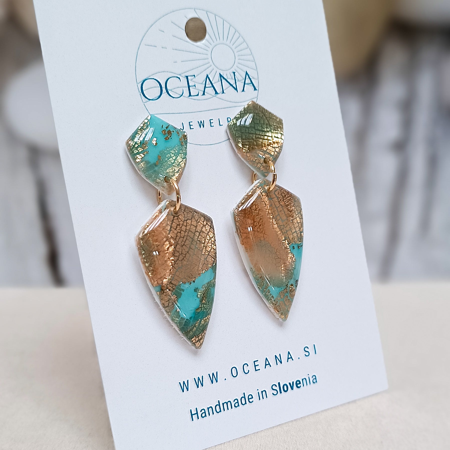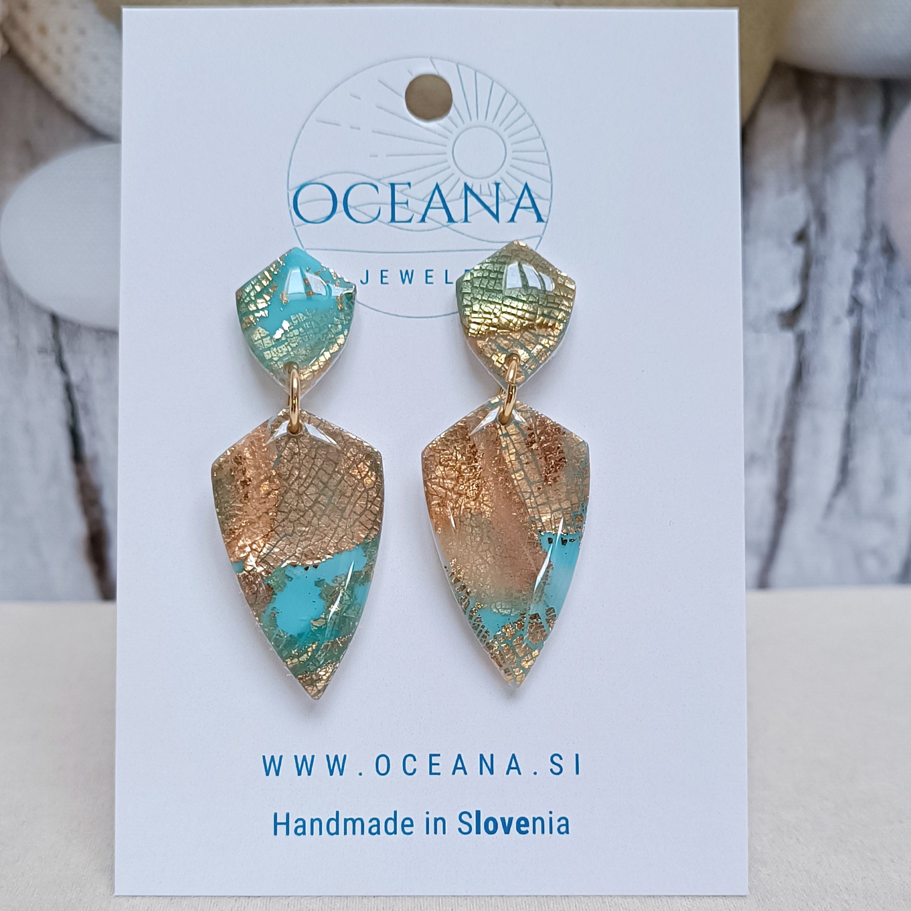 Uhani so izdelani iz kakovostne polimerne gline in prekriti s smolo, ki jim daje visok sijaj. Vsebujejo zlate lističe, robovi so brušeni iz pobarvani z zlato barvo za pridih elegance. Material je iz kiruršekga jekla, kar zagotavlja udobje in trpežnost, medtem ko gladka površina dodaja luksuzen videz. Navdihnjeni z mirno lepoto oceana so popolna kombinacija sofisticiranosti in narave.