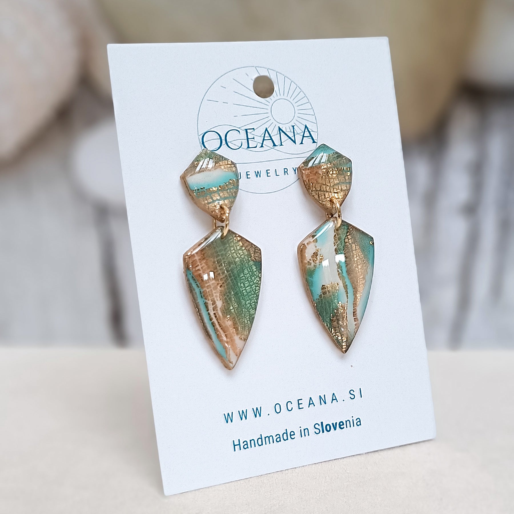 Uhani so izdelani iz kakovostne polimerne gline in prekriti s smolo, ki jim daje visok sijaj. Vsebujejo zlate lističe, robovi so brušeni iz pobarvani z zlato barvo za pridih elegance. Material je iz kiruršekga jekla, kar zagotavlja udobje in trpežnost, medtem ko gladka površina dodaja luksuzen videz. Navdihnjeni z mirno lepoto oceana so popolna kombinacija sofisticiranosti in narave.