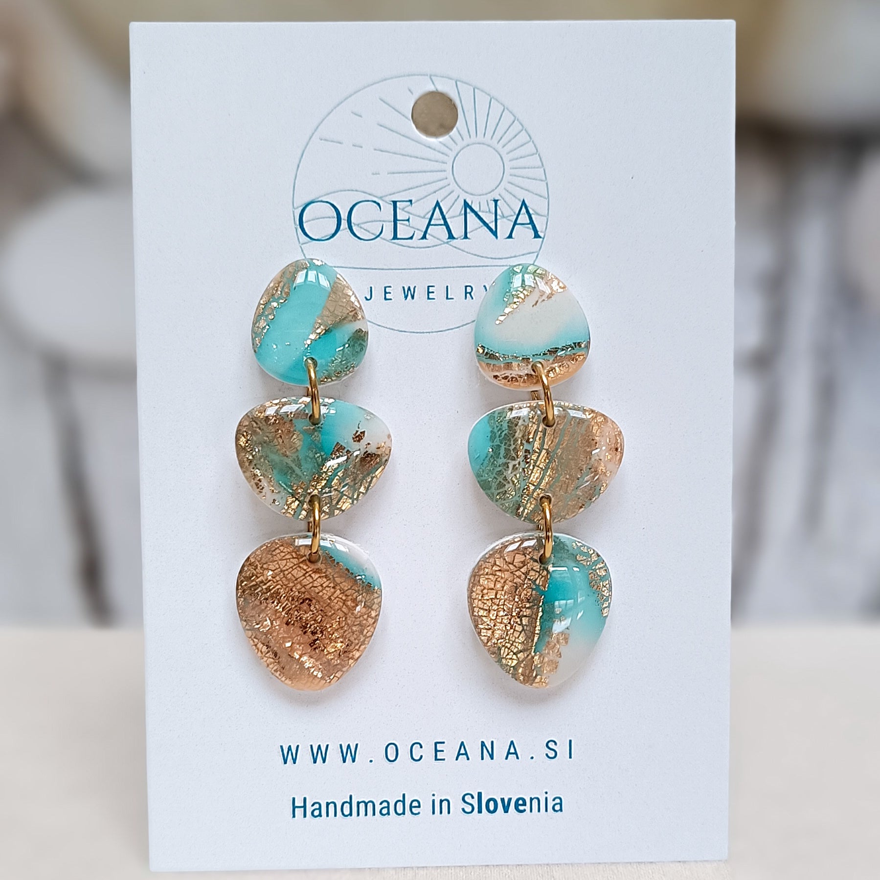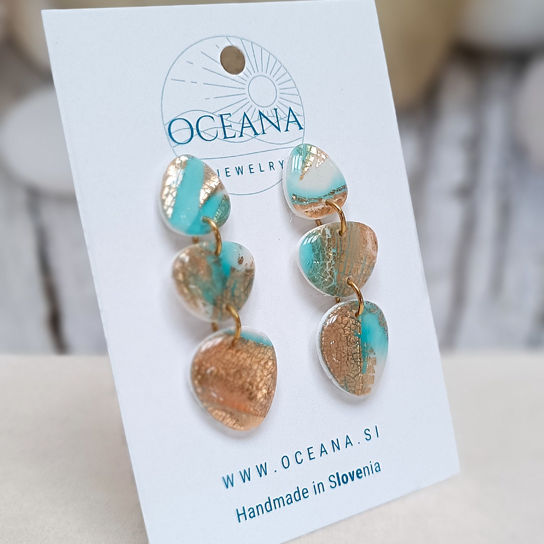 Uhani so izdelani iz kakovostne polimerne gline in prekriti s smolo, ki jim daje visok sijaj. Vsebujejo zlate lističe, robovi so brušeni iz pobarvani z zlato barvo za pridih elegance. Material je iz kiruršekga jekla, kar zagotavlja udobje in trpežnost, medtem ko gladka površina dodaja luksuzen videz. Navdihnjeni z mirno lepoto oceana so popolna kombinacija sofisticiranosti in narave.