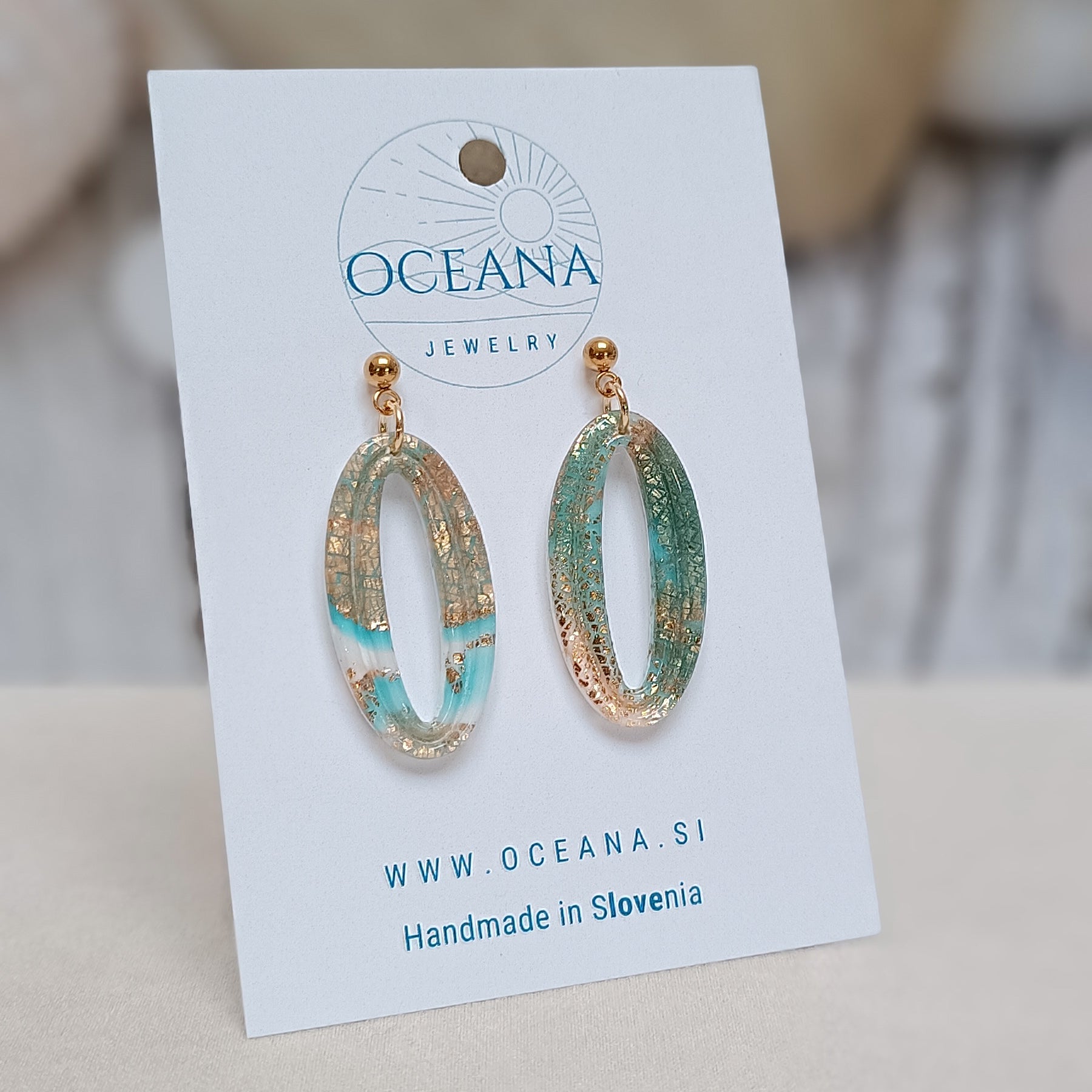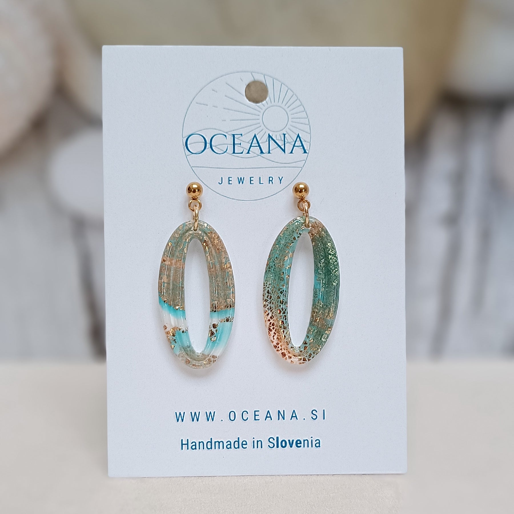 Uhani so izdelani iz kakovostne polimerne gline in prekriti s smolo, ki jim daje visok sijaj. Vsebujejo zlate lističe, robovi so brušeni iz pobarvani z zlato barvo za pridih elegance. Material je iz nerjavečega jekla, kar zagotavlja udobje in trpežnost, medtem ko gladka površina dodaja luksuzen videz. Navdihnjeni z mirno lepoto oceana so popolna kombinacija sofisticiranosti in narave.