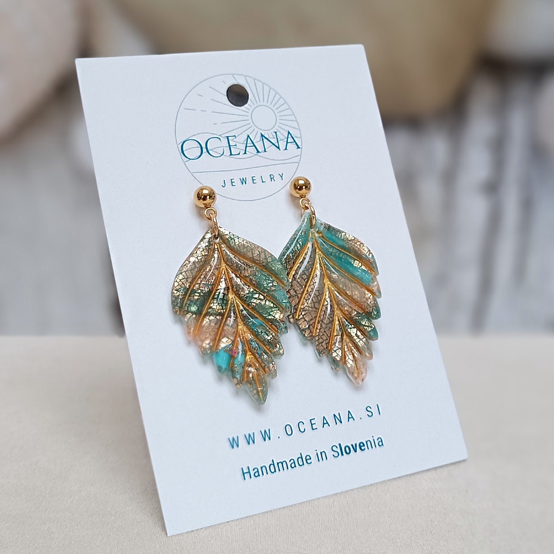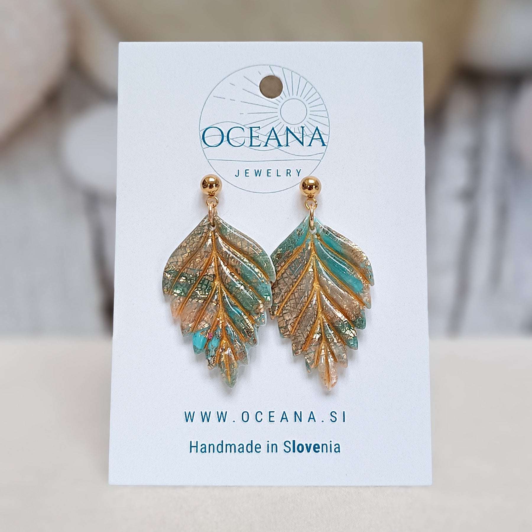 Uhani so izdelani iz kakovostne polimerne gline in prekriti s smolo, ki jim daje visok sijaj. Vsebujejo zlate lističe, robovi so brušeni iz pobarvani z zlato barvo za pridih elegance. Material je iz nerjavečega jekla, kar zagotavlja udobje in trpežnost, medtem ko gladka površina dodaja luksuzen videz. Navdihnjeni z mirno lepoto oceana so popolna kombinacija sofisticiranosti in narave.