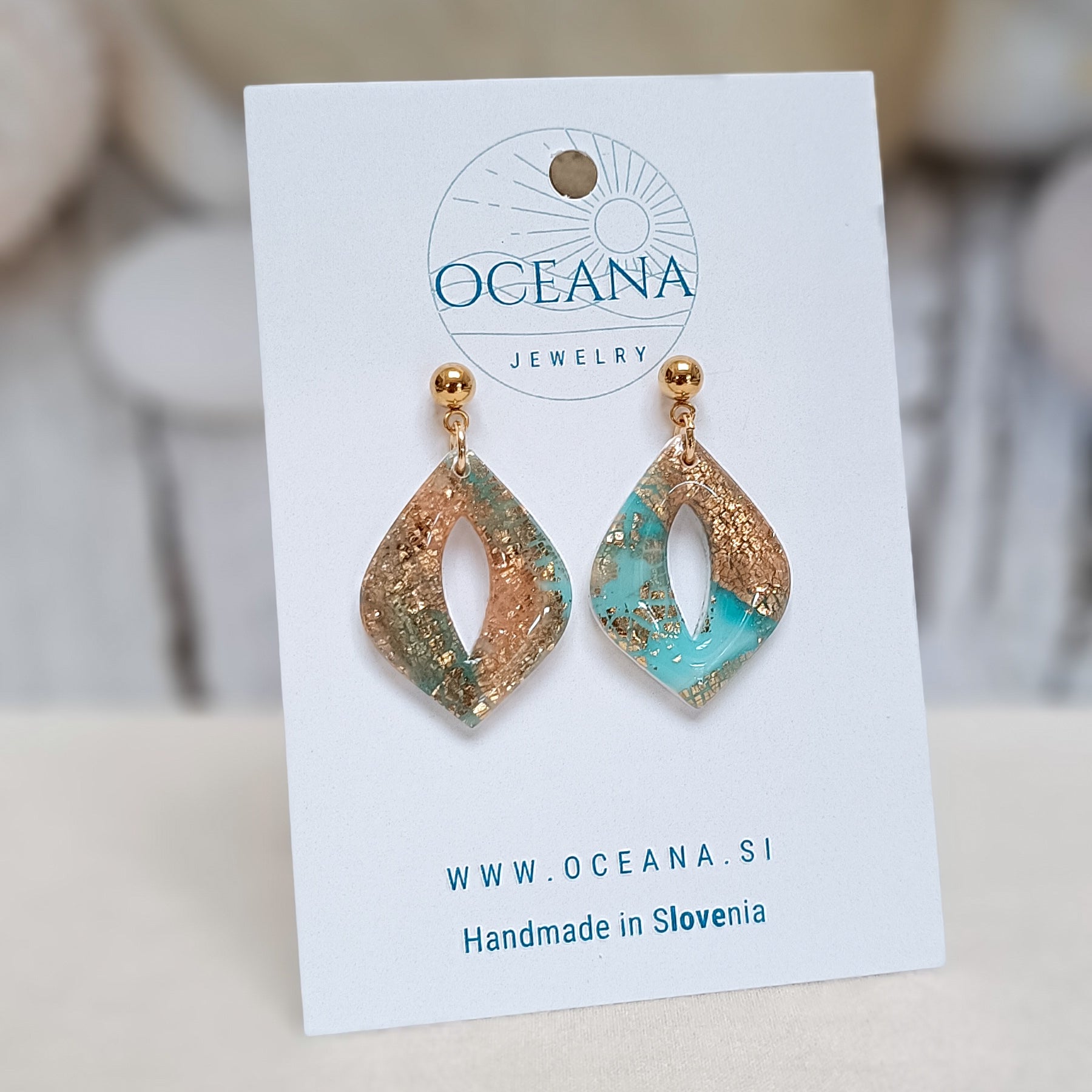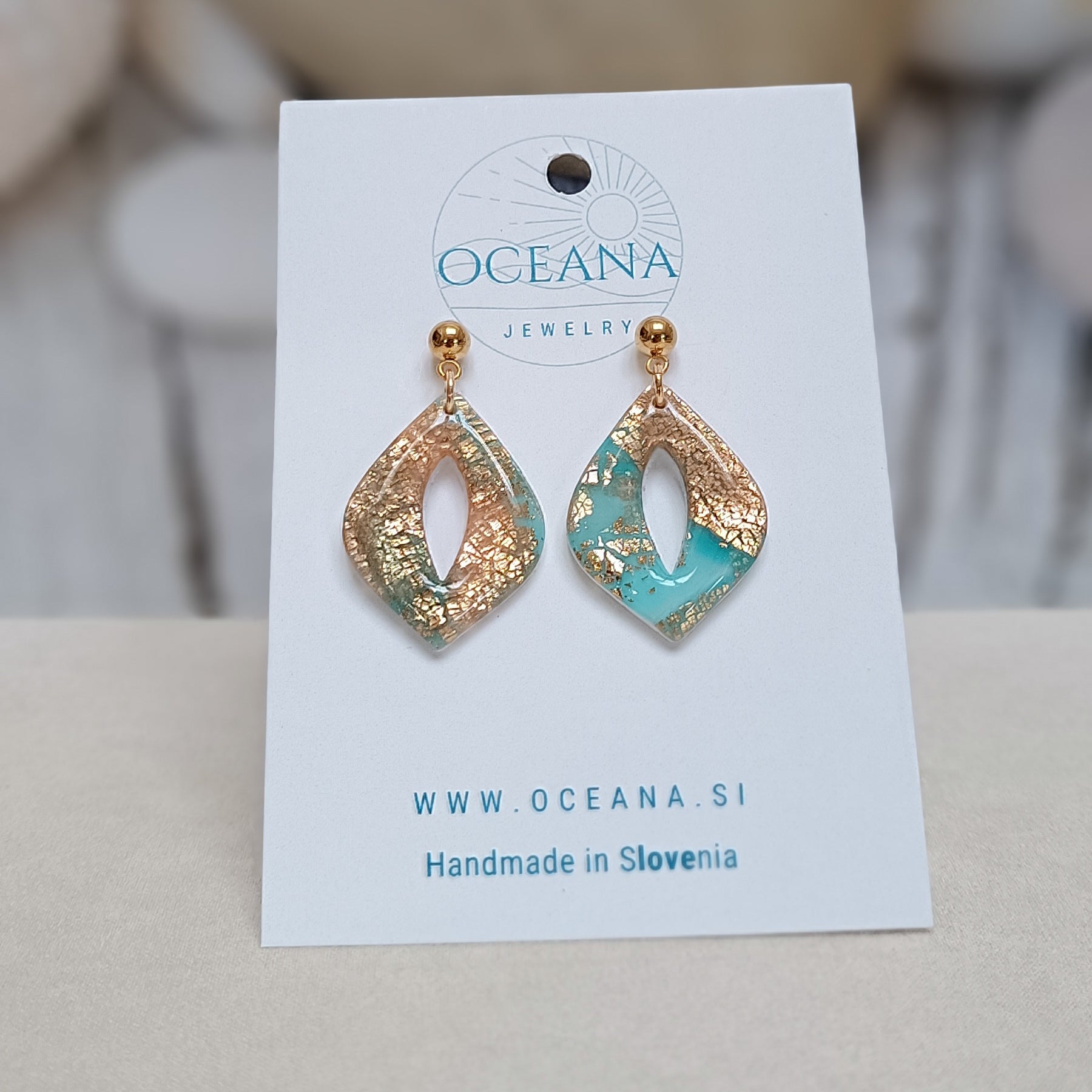 Uhani so izdelani iz kakovostne polimerne gline in prekriti s smolo, ki jim daje visok sijaj. Vsebujejo zlate lističe, robovi so brušeni iz pobarvani z zlato barvo za pridih elegance. Material je iz nerjavečega jekla, kar zagotavlja udobje in trpežnost, medtem ko gladka površina dodaja luksuzen videz. Navdihnjeni z mirno lepoto oceana so popolna kombinacija sofisticiranosti in narave.