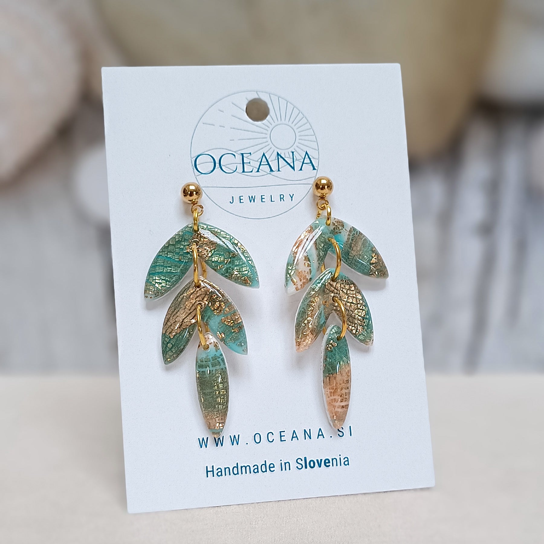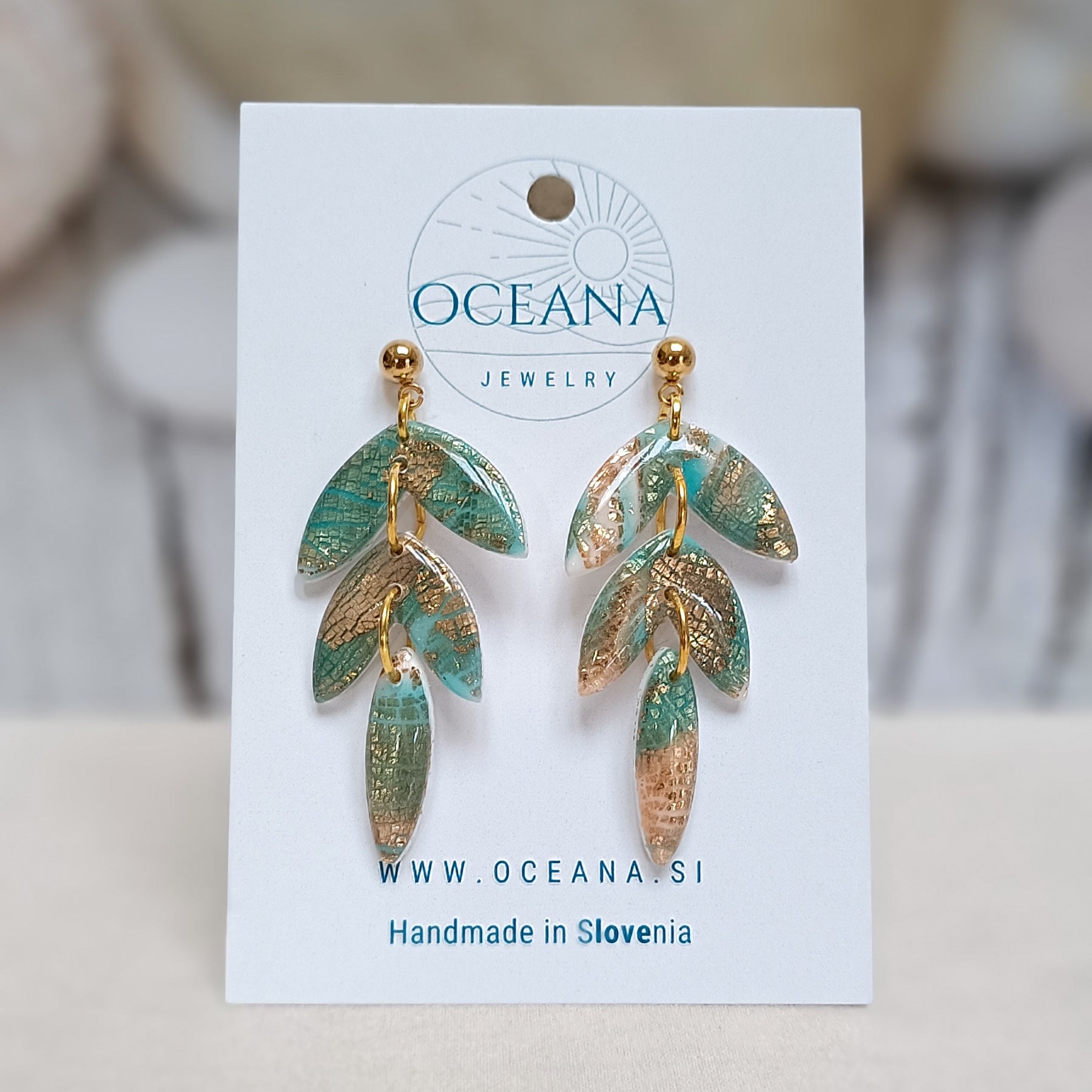 Uhani so izdelani iz kakovostne polimerne gline in prekriti s smolo, ki jim daje visok sijaj. Vsebujejo zlate lističe, robovi so brušeni iz pobarvani z zlato barvo za pridih elegance. Material je iz nerjavečega jekla, kar zagotavlja udobje in trpežnost, medtem ko gladka površina dodaja luksuzen videz. Navdihnjeni z mirno lepoto oceana so popolna kombinacija sofisticiranosti in narave.