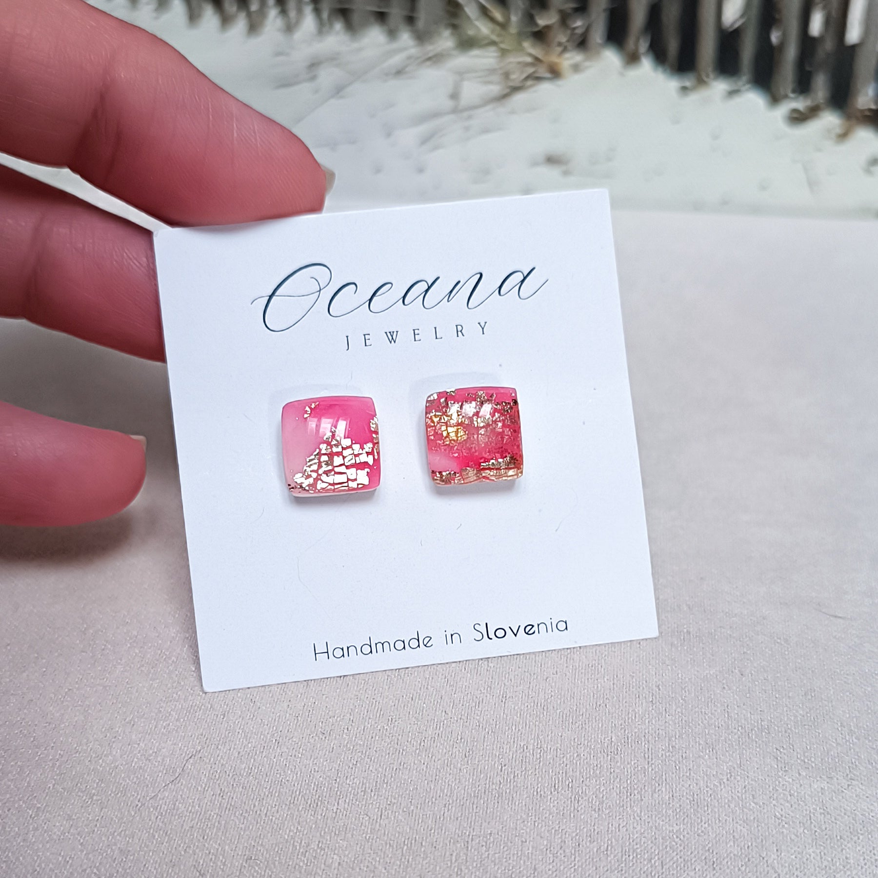 Embrace bold elegance with the Scarlet Luxe Collection. These handcrafted pieces feature a stunning blend of high quality translucent polymer clay and fucsia and delicate gold leaf accents. They are finished with a smooth resing coating and set on stainless steel post and they offer a perfect combination of modern sophistication and timeless beauty.