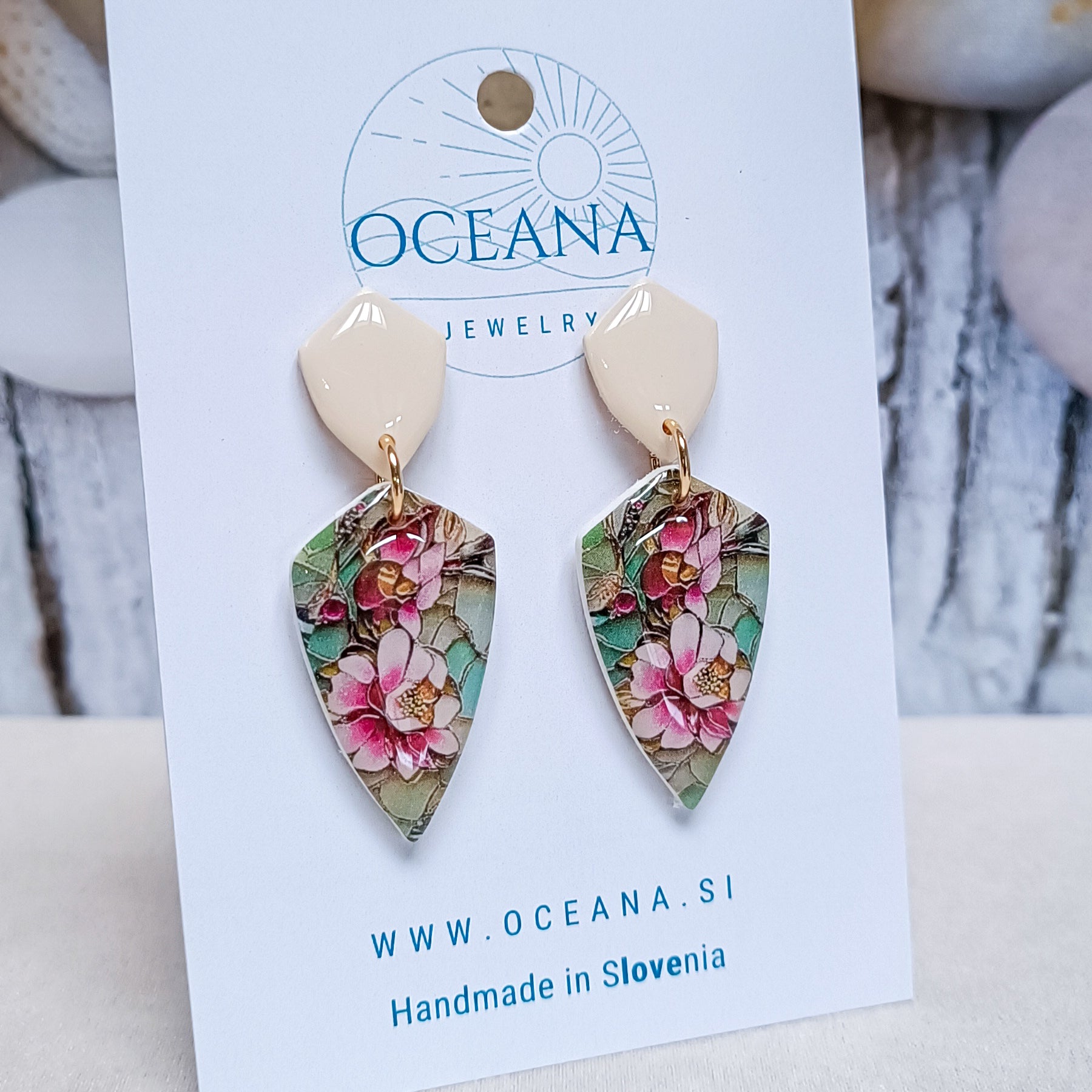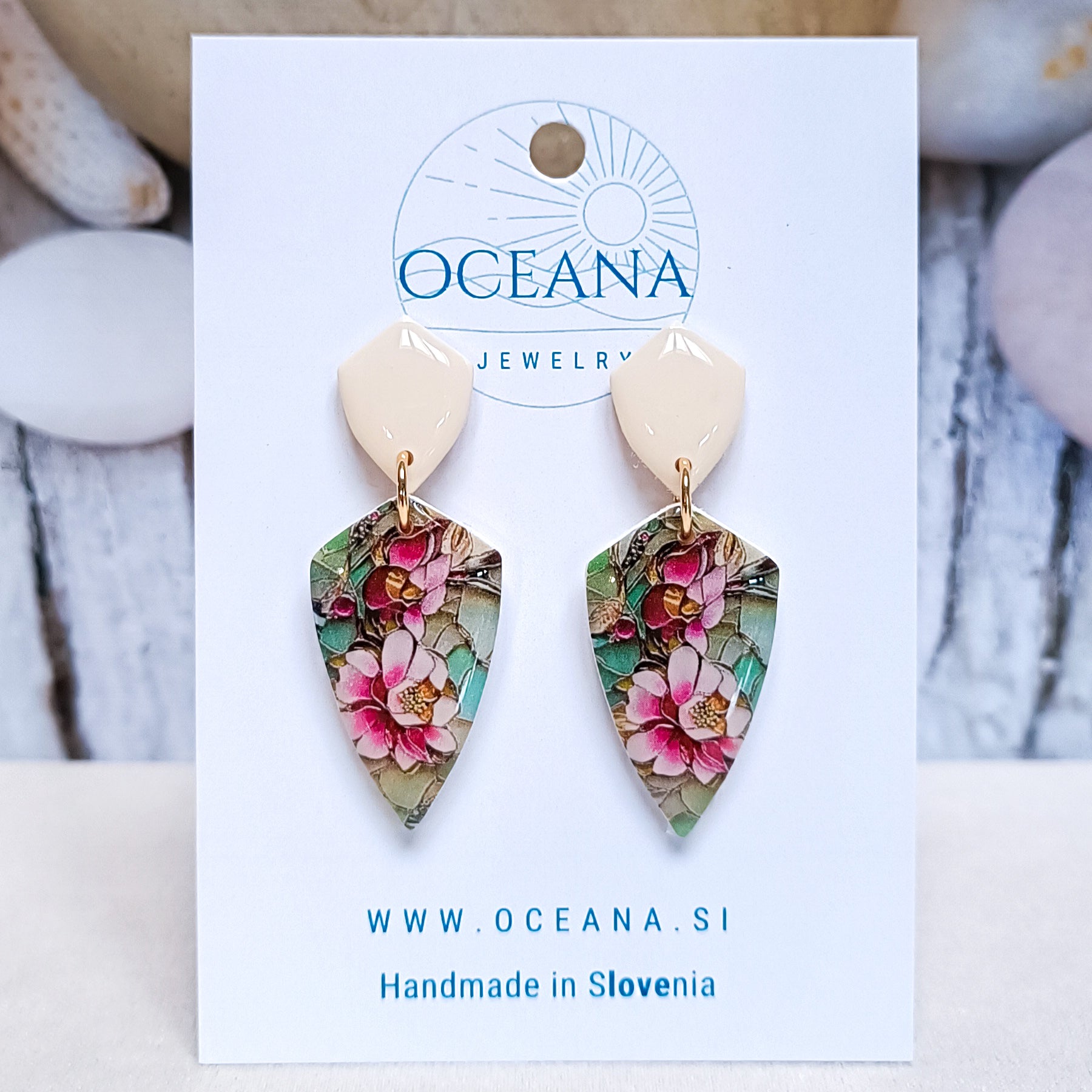 Ročno izdelani uhani iz polimerne gline, ki so prekriti z epoksi smolo za dodaten sijaj in zaščito, navdinjeni so z lepoto vitraža. Vsak kos ujame svetlobo na svoj način - kot majhno okence barv in duše. Zatič je iz kirurškega jekla za udobje. ž