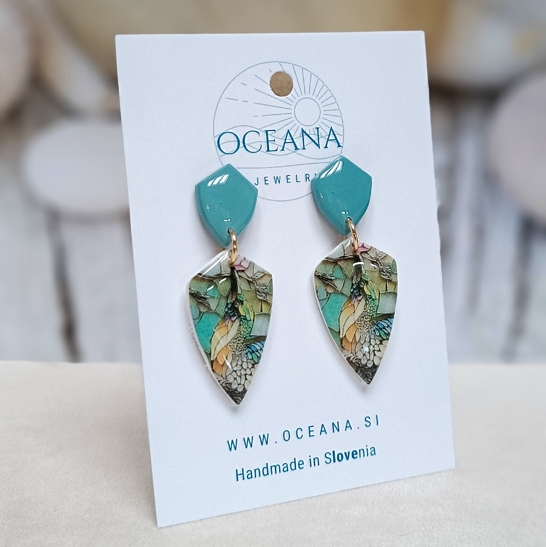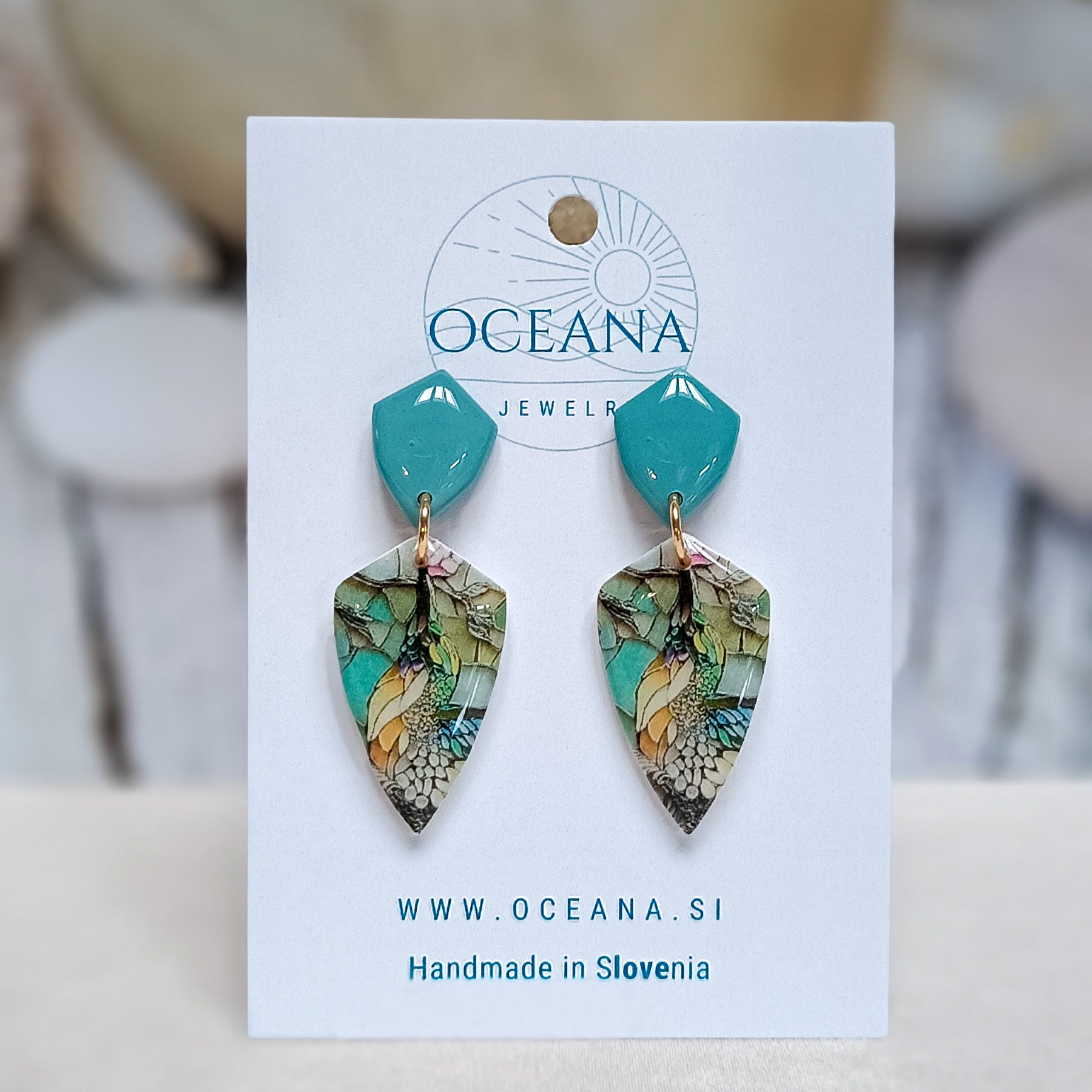 Ročno izdelani uhani iz polimerne gline, ki so prekriti z epoksi smolo za dodaten sijaj in zaščito, navdinjeni so z lepoto vitraža. Vsak kos ujame svetlobo na svoj način - kot majhno okence barv in duše. Zatič je iz kirurškega jekla za udobje. ž