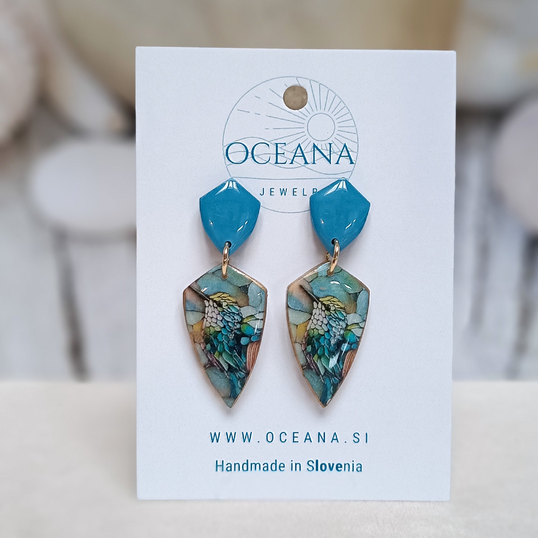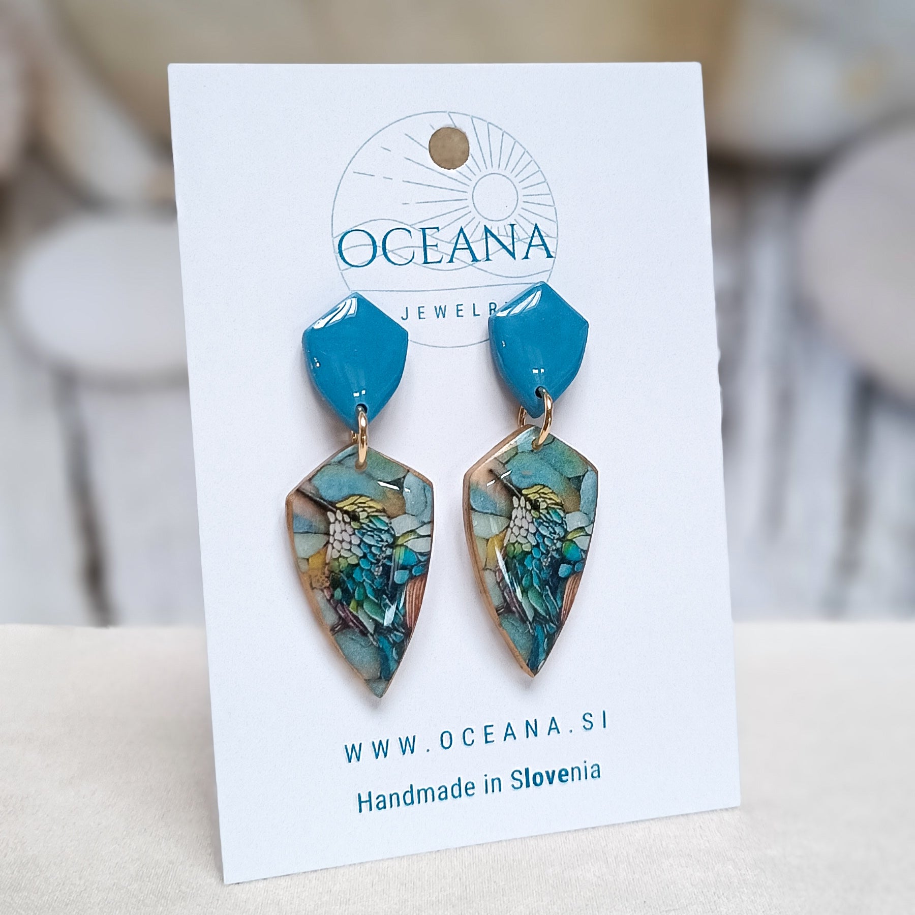 Ročno izdelani uhani iz polimerne gline, ki so prekriti z epoksi smolo za dodaten sijaj in zaščito, navdinjeni so z lepoto vitraža. Vsak kos ujame svetlobo na svoj način - kot majhno okence barv in duše. Zatič je iz kirurškega jekla za udobje. ž