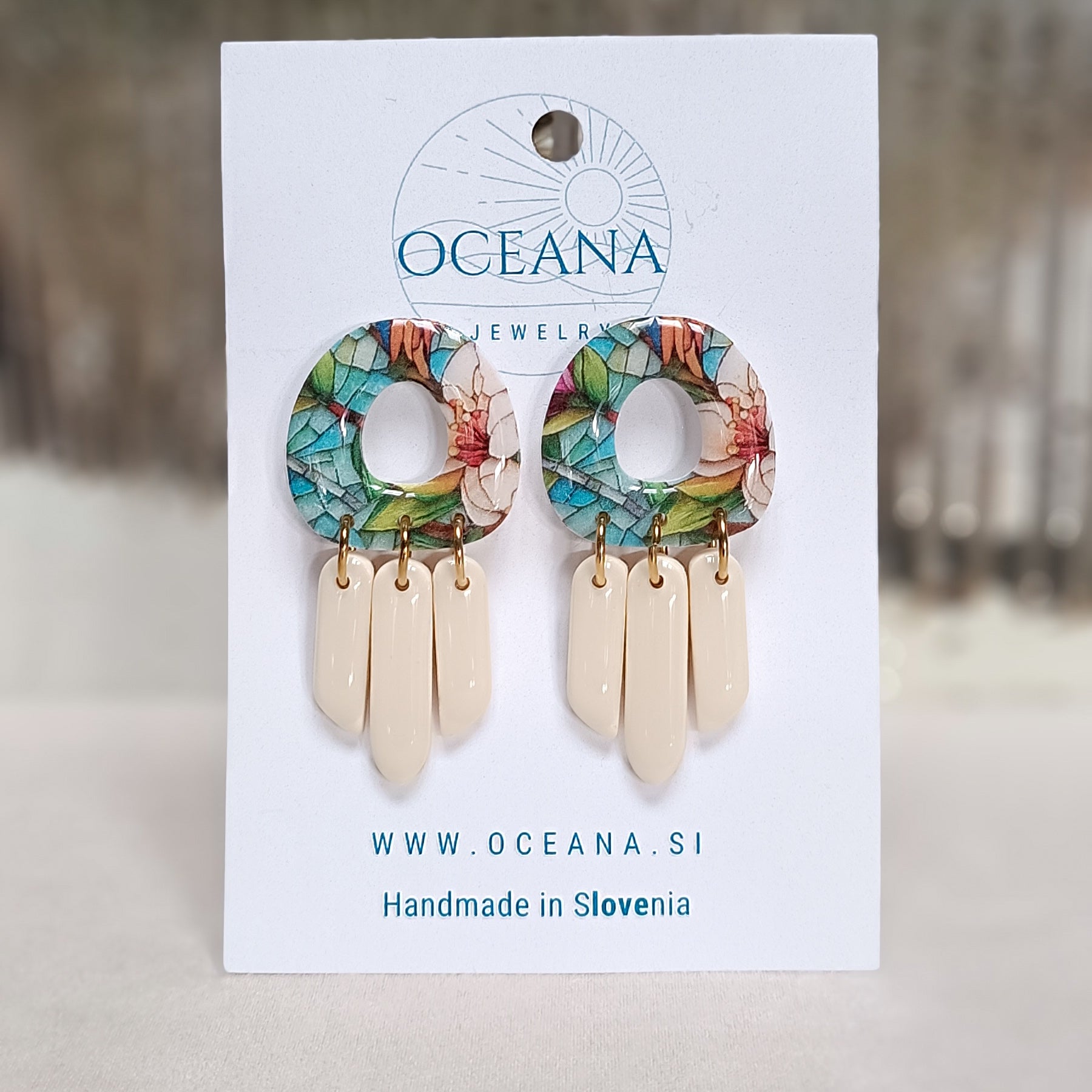 Ročno izdelani uhani iz polimerne gline, ki so prekriti z epoksi smolo za dodaten sijaj in zaščito, navdinjeni so z lepoto vitraža. Vsak kos ujame svetlobo na svoj način - kot majhno okence barv in duše. Zatič je iz kirurškega jekla za udobje. ž
