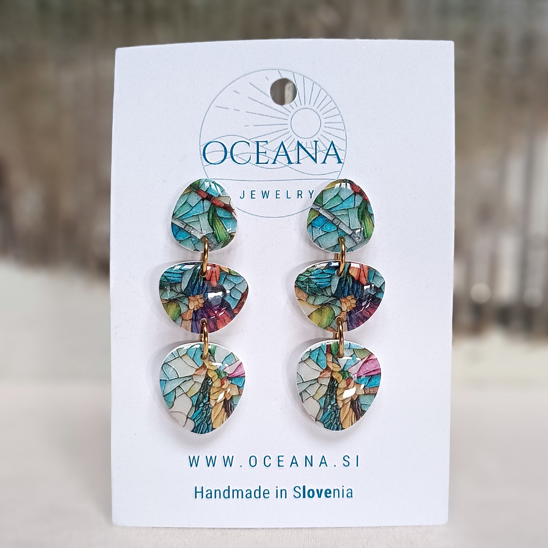 Ročno izdelani uhani iz polimerne gline, ki so prekriti z epoksi smolo za dodaten sijaj in zaščito, navdinjeni so z lepoto vitraža. Vsak kos ujame svetlobo na svoj način - kot majhno okence barv in duše. Zatič je iz kirurškega jekla za udobje. ž
