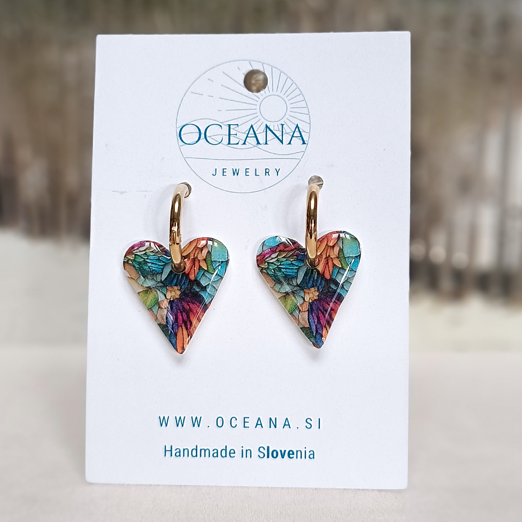 Ročno izdelani uhani iz polimerne gline, ki so prekriti z epoksi smolo za dodaten sijaj in zaščito, navdinjeni so z lepoto vitraža. Vsak kos ujame svetlobo na svoj način - kot majhno okence barv in duše. Zatič je iz nerjavečega jekla.