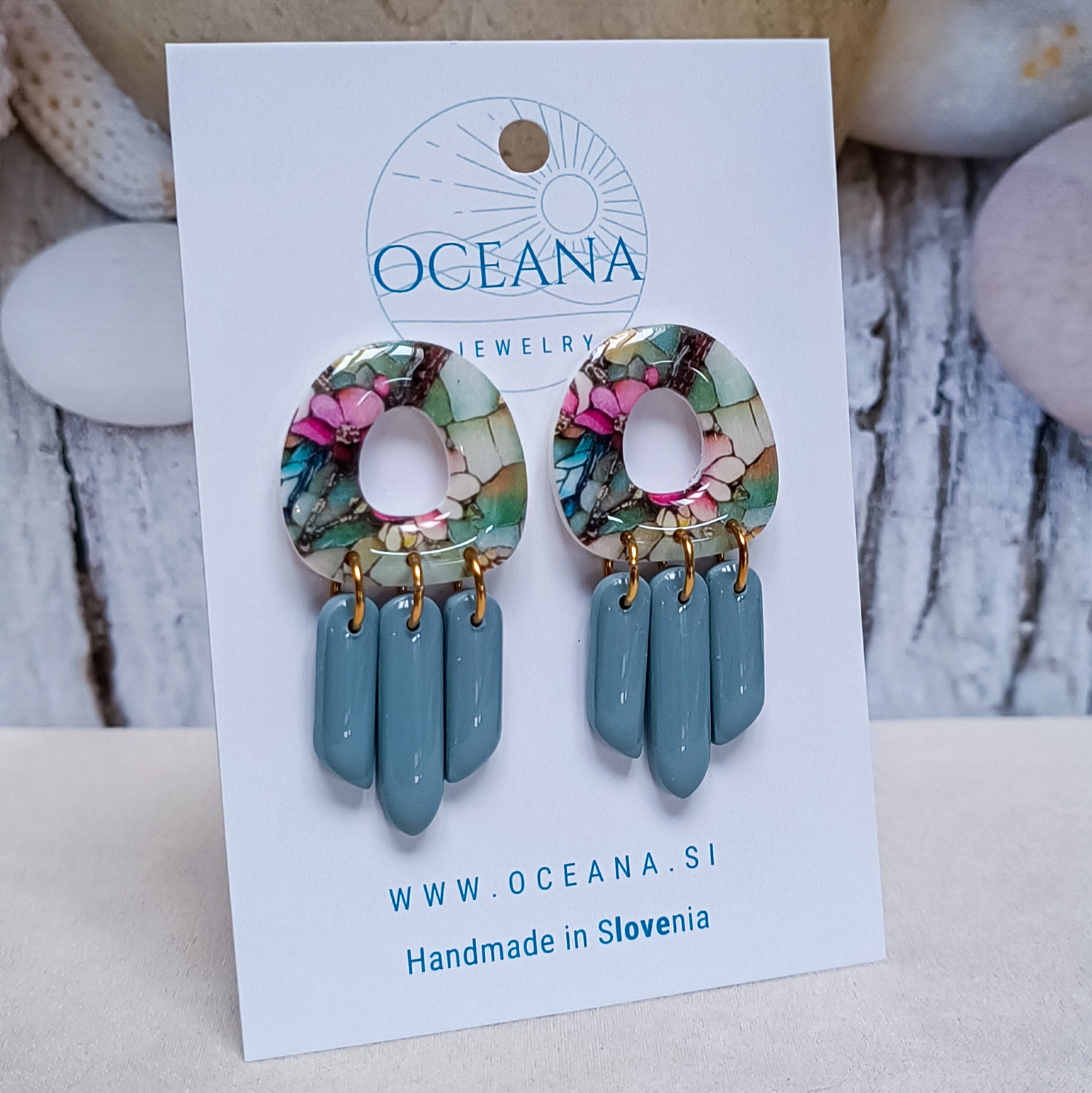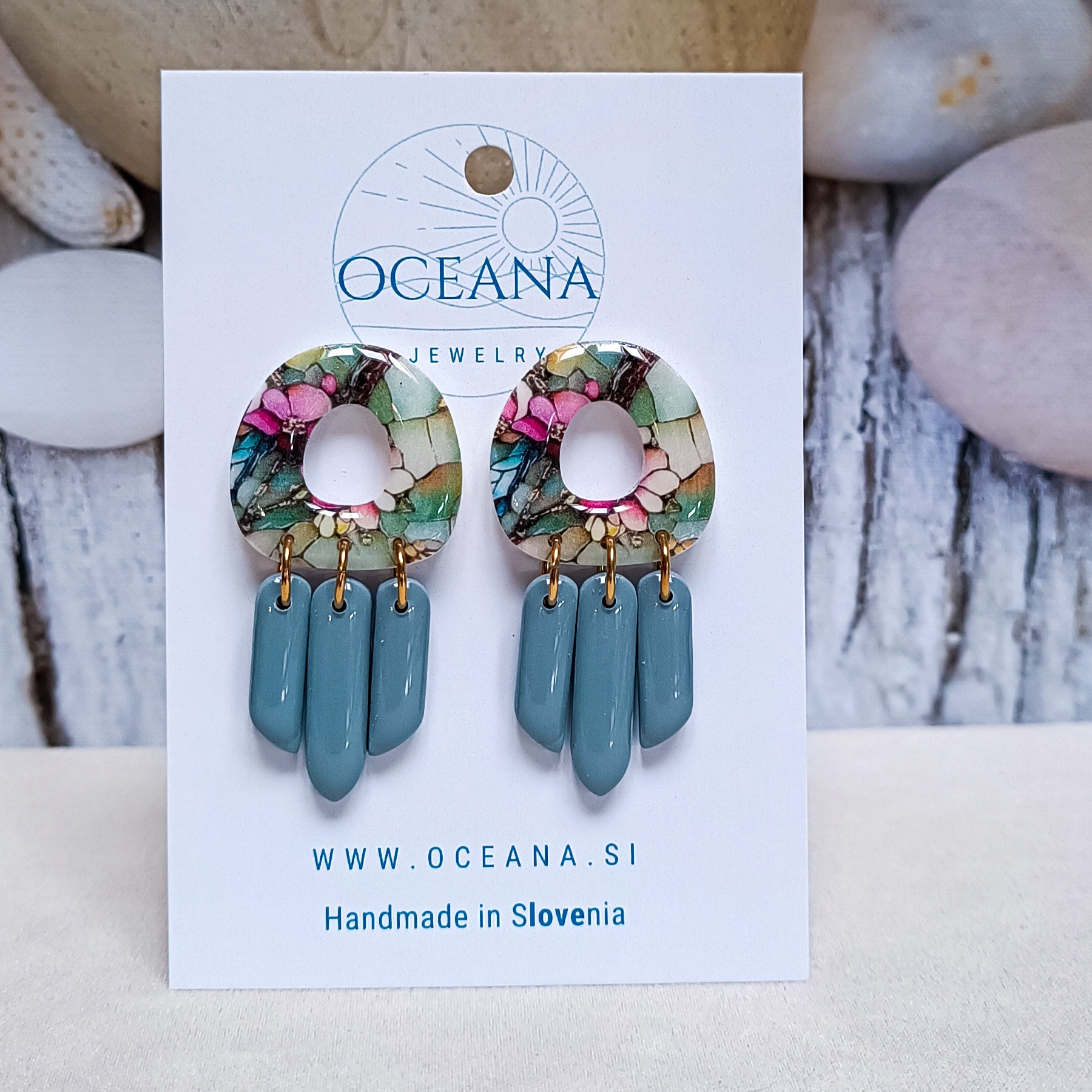 Ročno izdelani uhani iz polimerne gline, ki so prekriti z epoksi smolo za dodaten sijaj in zaščito, navdinjeni so z lepoto vitraža. Vsak kos ujame svetlobo na svoj način - kot majhno okence barv in duše. Zatič je iz kirurškega jekla za udobje. ž
