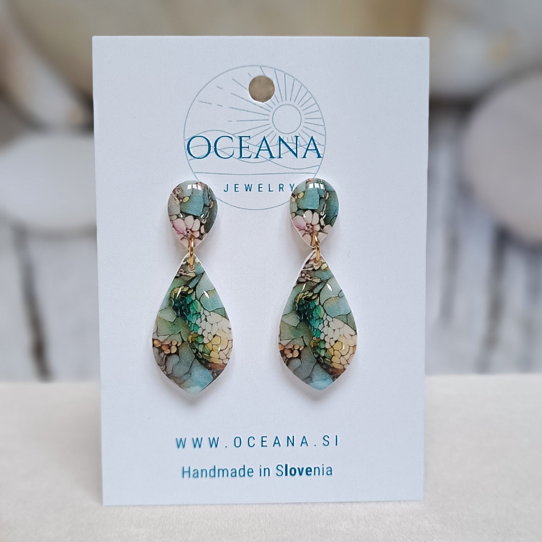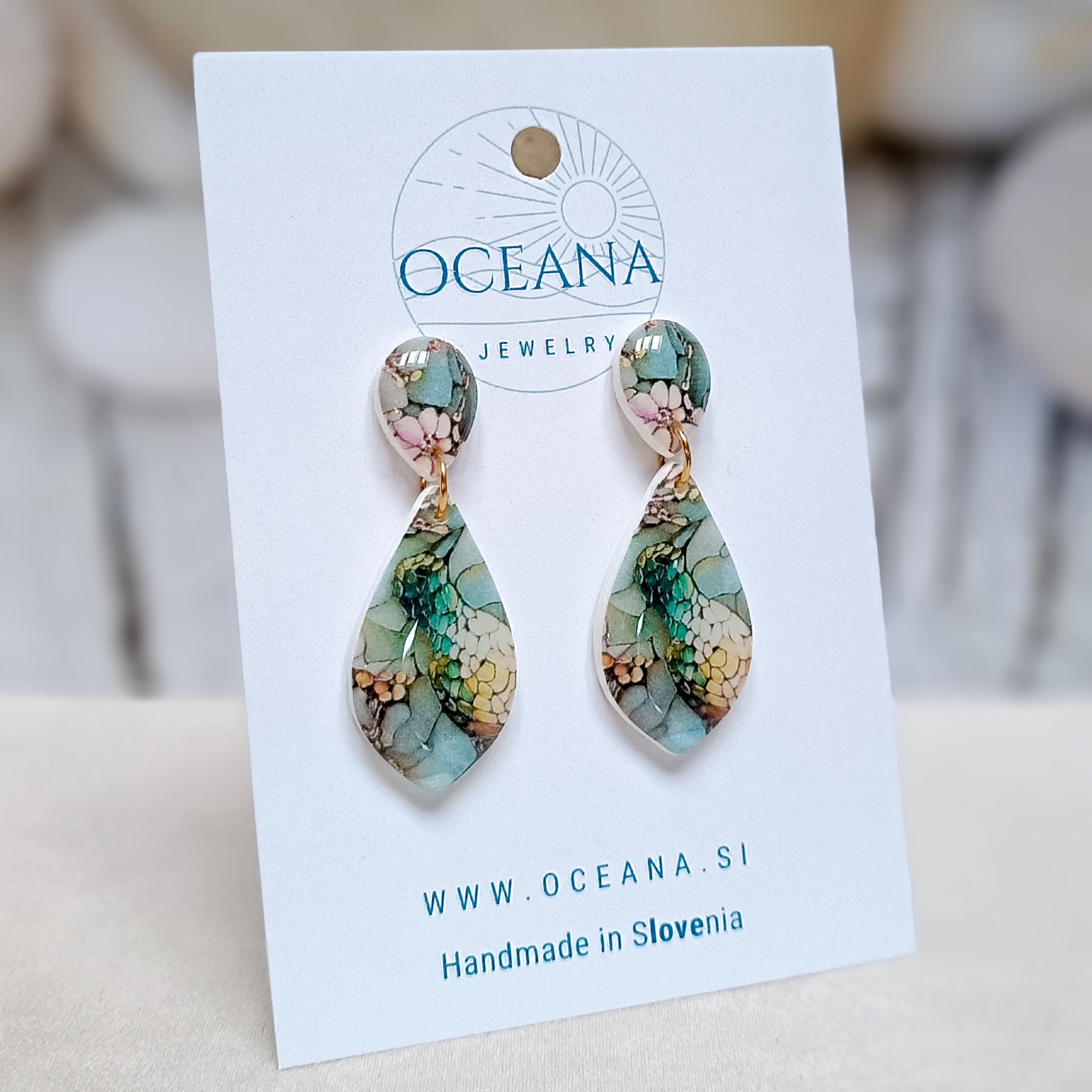 Ročno izdelani uhani iz polimerne gline, ki so prekriti z epoksi smolo za dodaten sijaj in zaščito, navdinjeni so z lepoto vitraža. Vsak kos ujame svetlobo na svoj način - kot majhno okence barv in duše. Zatič je iz kirurškega jekla za udobje. ž