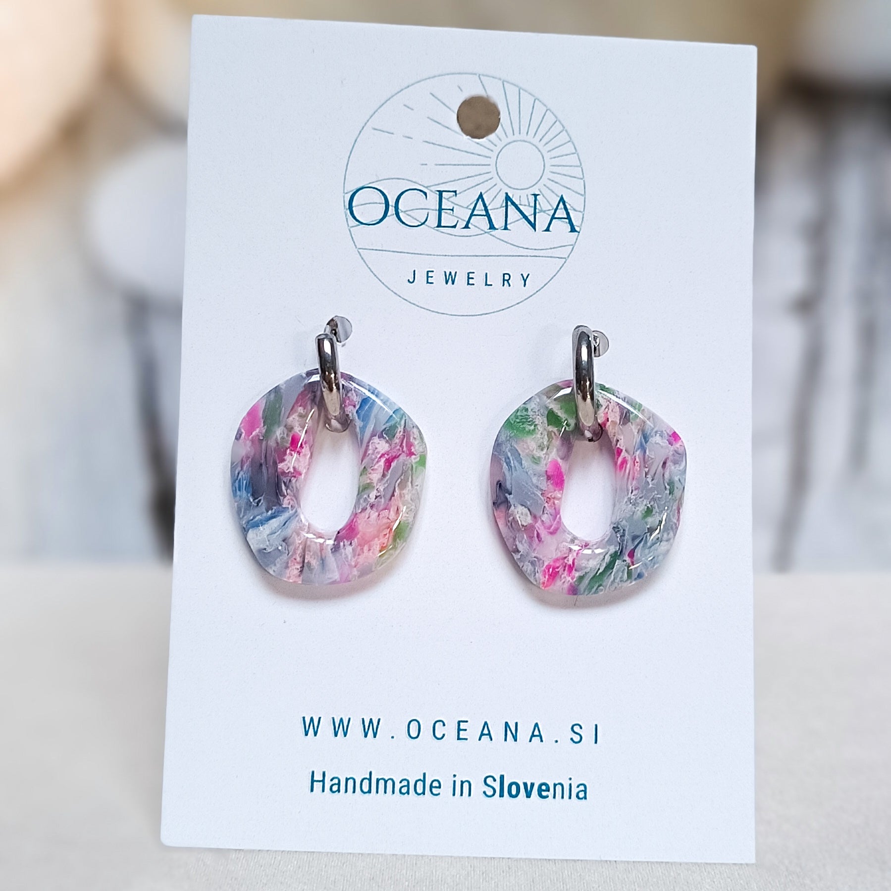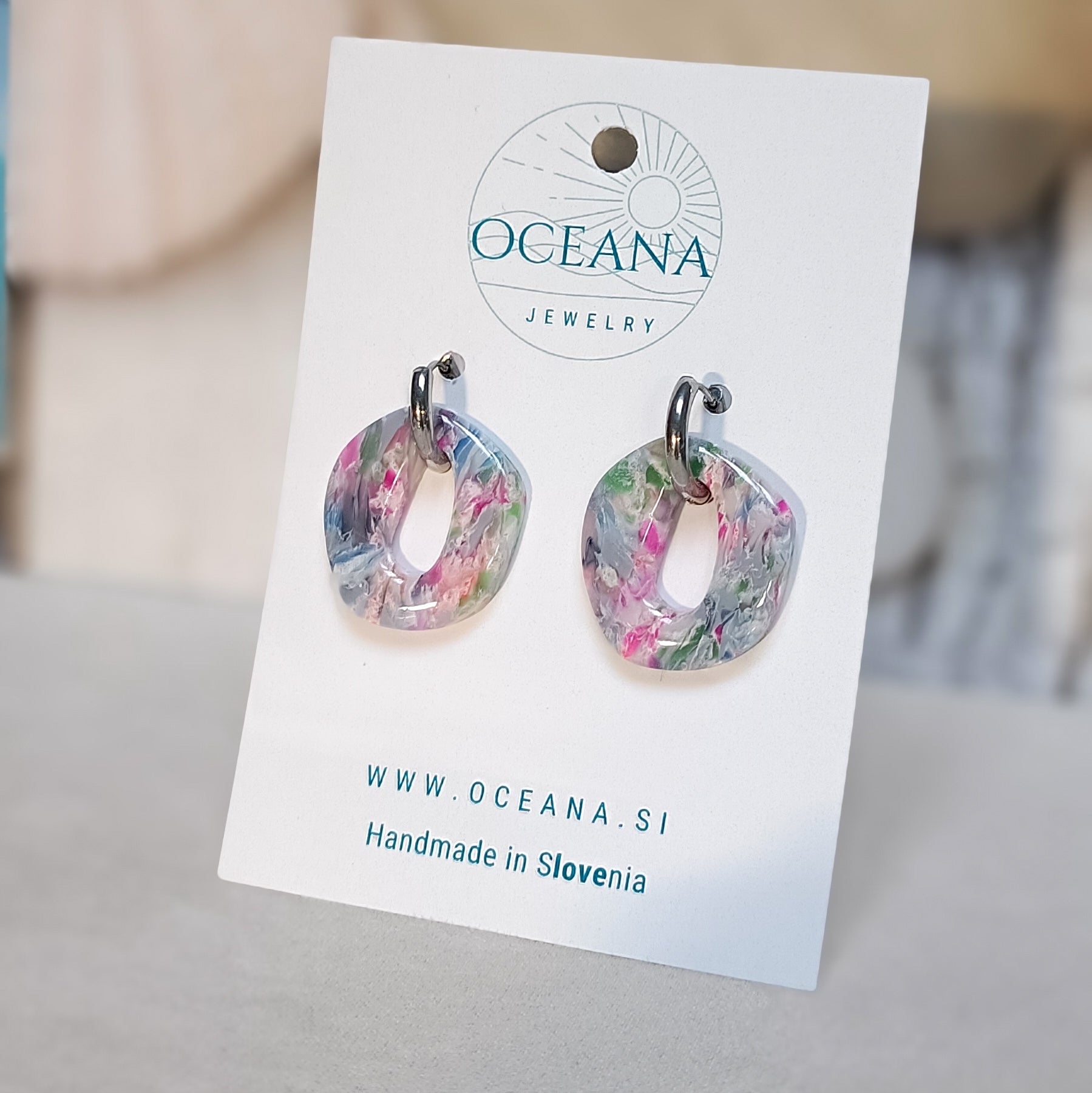 Elegantni uhani iz polimerne gline, ki posnemajo lepoto kamna in marmorja. Zaključeni so z gladkim smolnim premazom, material je iz nerjavečega jekla. Ti uhani so izredno lahki in zato primerni za celodnevno nošenje.
