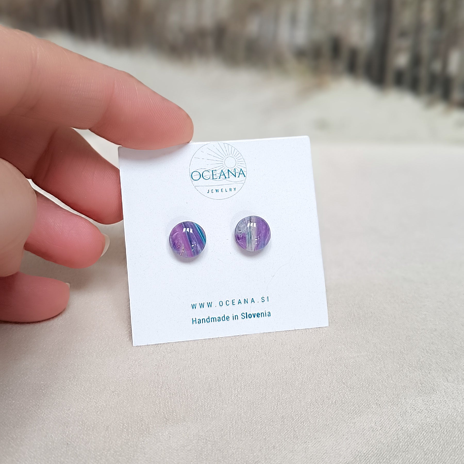 Elegantni uhani iz polimerne gline, ki posnemajo lepoto kamna in marmorja. Zaključeni so z gladkim smolnim premazom, material je iz kirurškega jekla in je primeren tudi za občutljiva ušesa. Ti uhani so izredno lahki in zato primerni za celodnevno nošenje.
