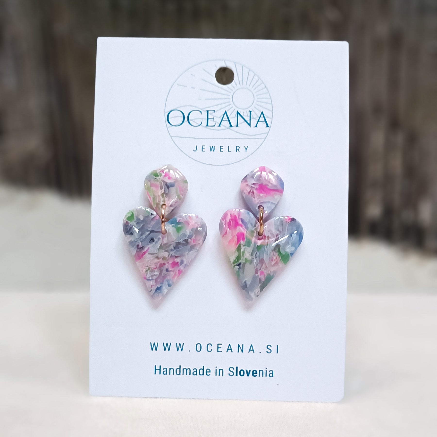 Elegantni uhani iz polimerne gline, ki posnemajo lepoto kamna in marmorja. Zaključeni so z gladkim smolnim premazom, material je iz kirurškega jekla in je primeren tudi za občutljiva ušesa. Ti uhani so izredno lahki in zato primerni za celodnevno nošenje.
