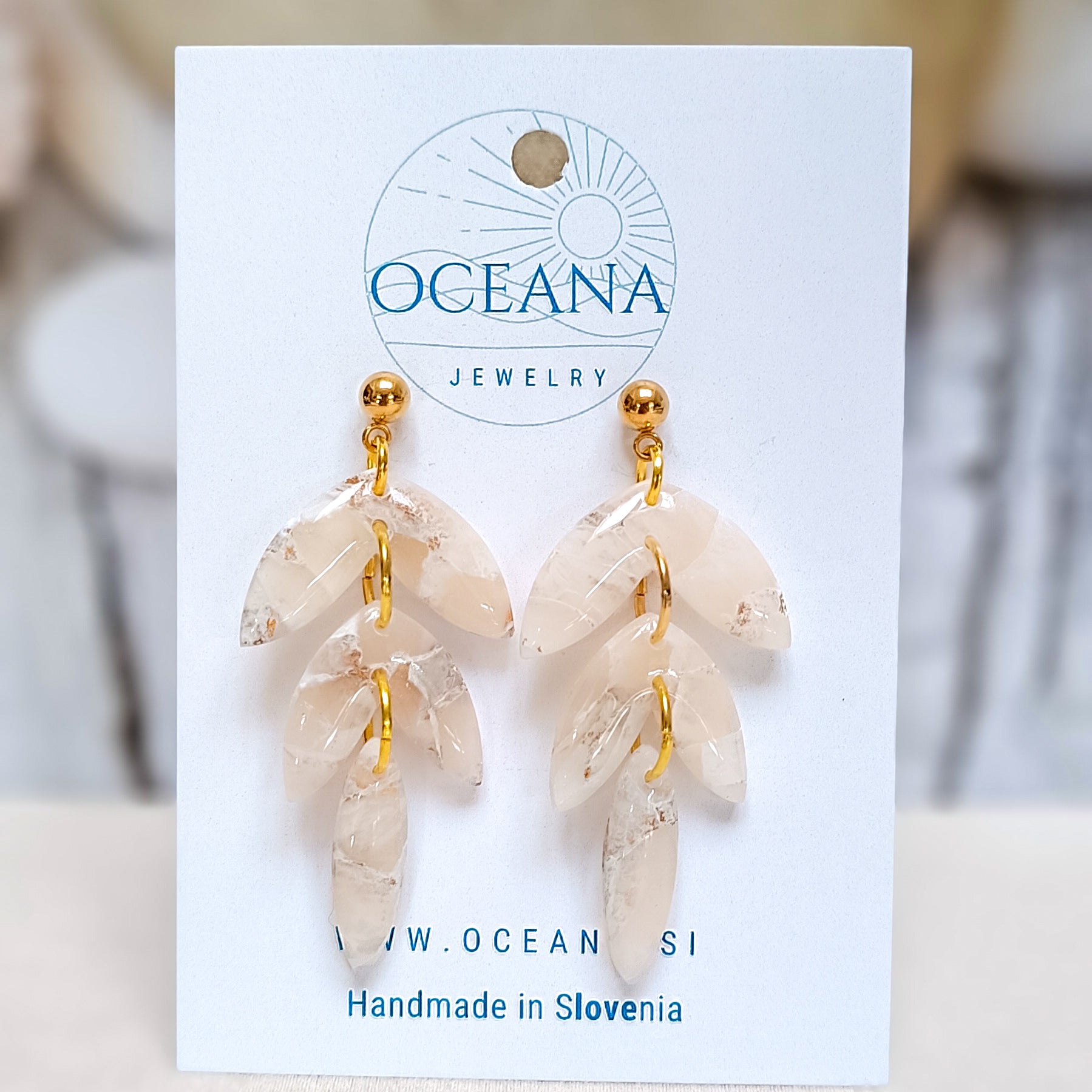 Elegantni uhani iz polimerne gline, ki posnemajo lepoto kamna in marmorja. Zaključeni so z gladkim smolnim premazom, material je iz jekla in je primeren tudi za občutljiva ušesa. Ti uhani so izredno lahki in zato primerni za celodnevno nošenje.
