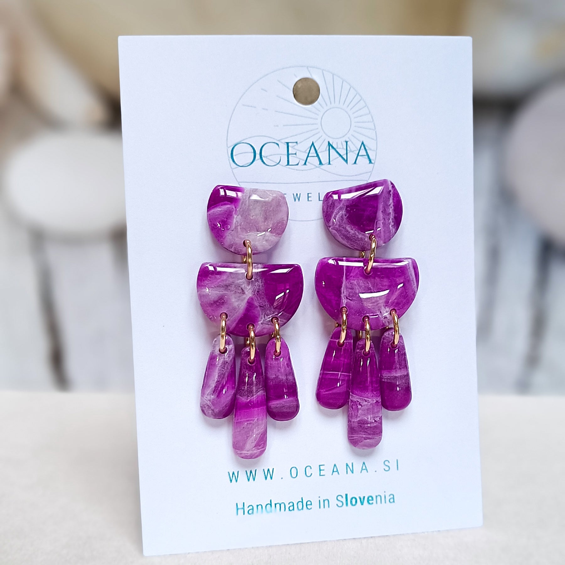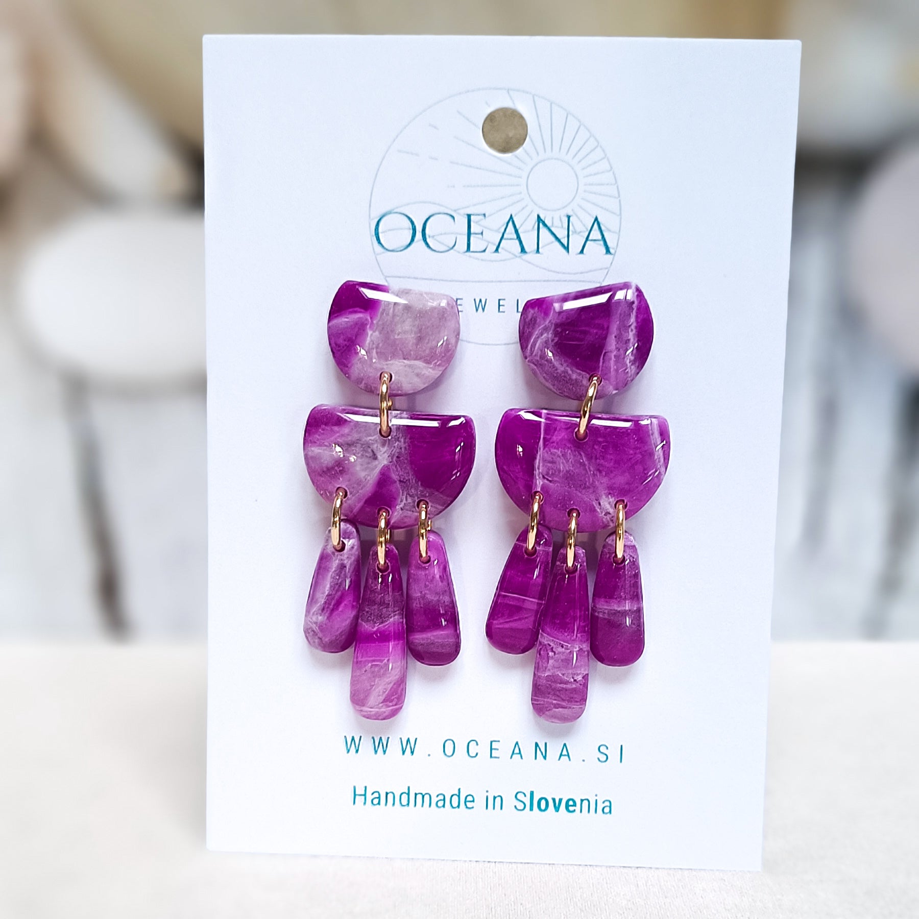 Elegantni uhani iz polimerne gline, ki posnemajo lepoto kamna in marmorja. Zaključeni so z gladkim smolnim premazom, material je iz kirurškega jekla in je primeren tudi za občutljiva ušesa. Ti uhani so izredno lahki in zato primerni za celodnevno nošenje.