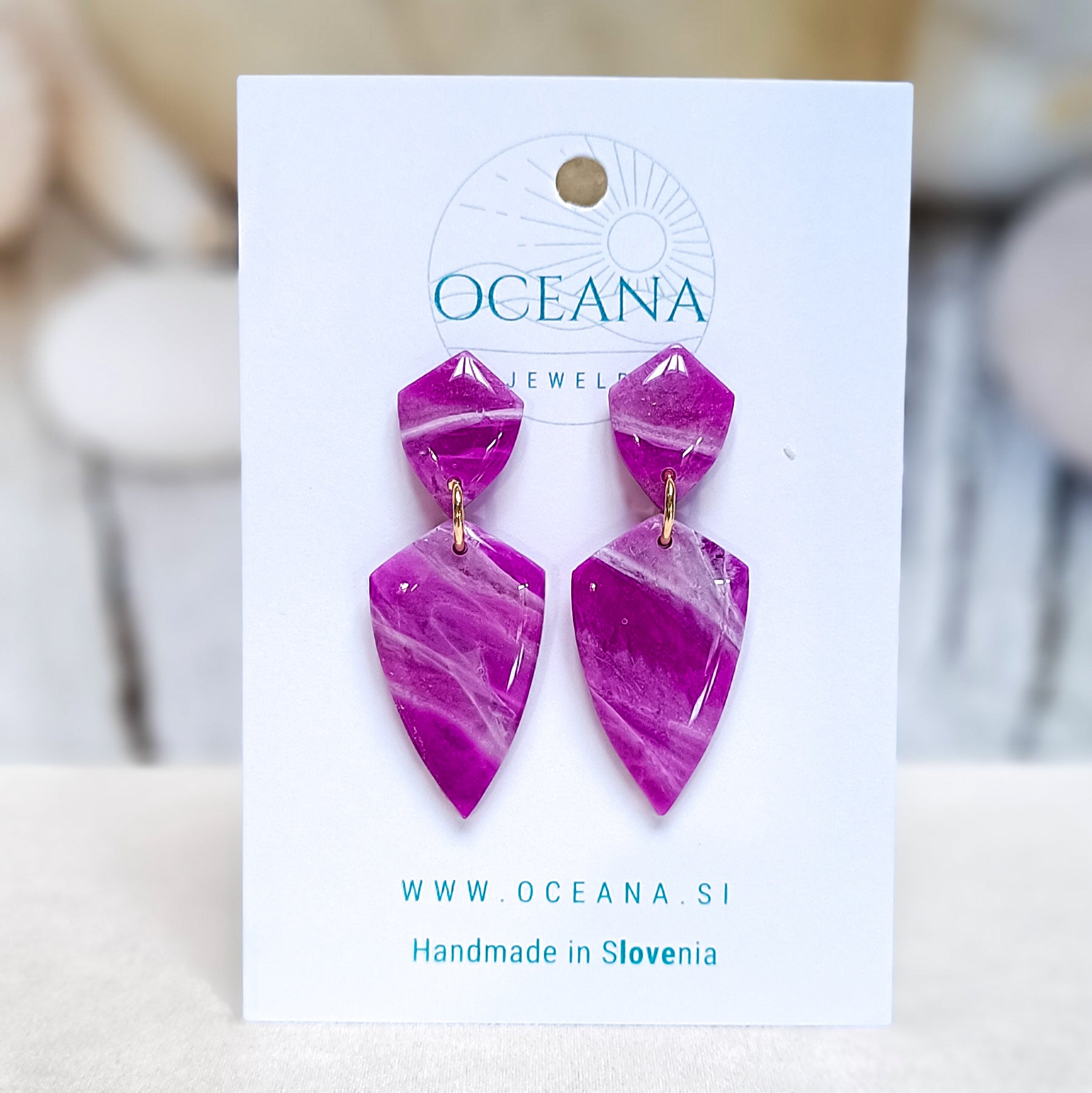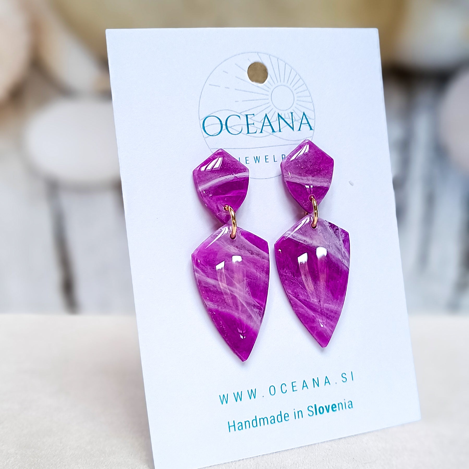 Elegantni uhani iz polimerne gline, ki posnemajo lepoto kamna in marmorja. Zaključeni so z gladkim smolnim premazom, material je iz kirurškega jekla in je primeren tudi za občutljiva ušesa. Ti uhani so izredno lahki in zato primerni za celodnevno nošenje.