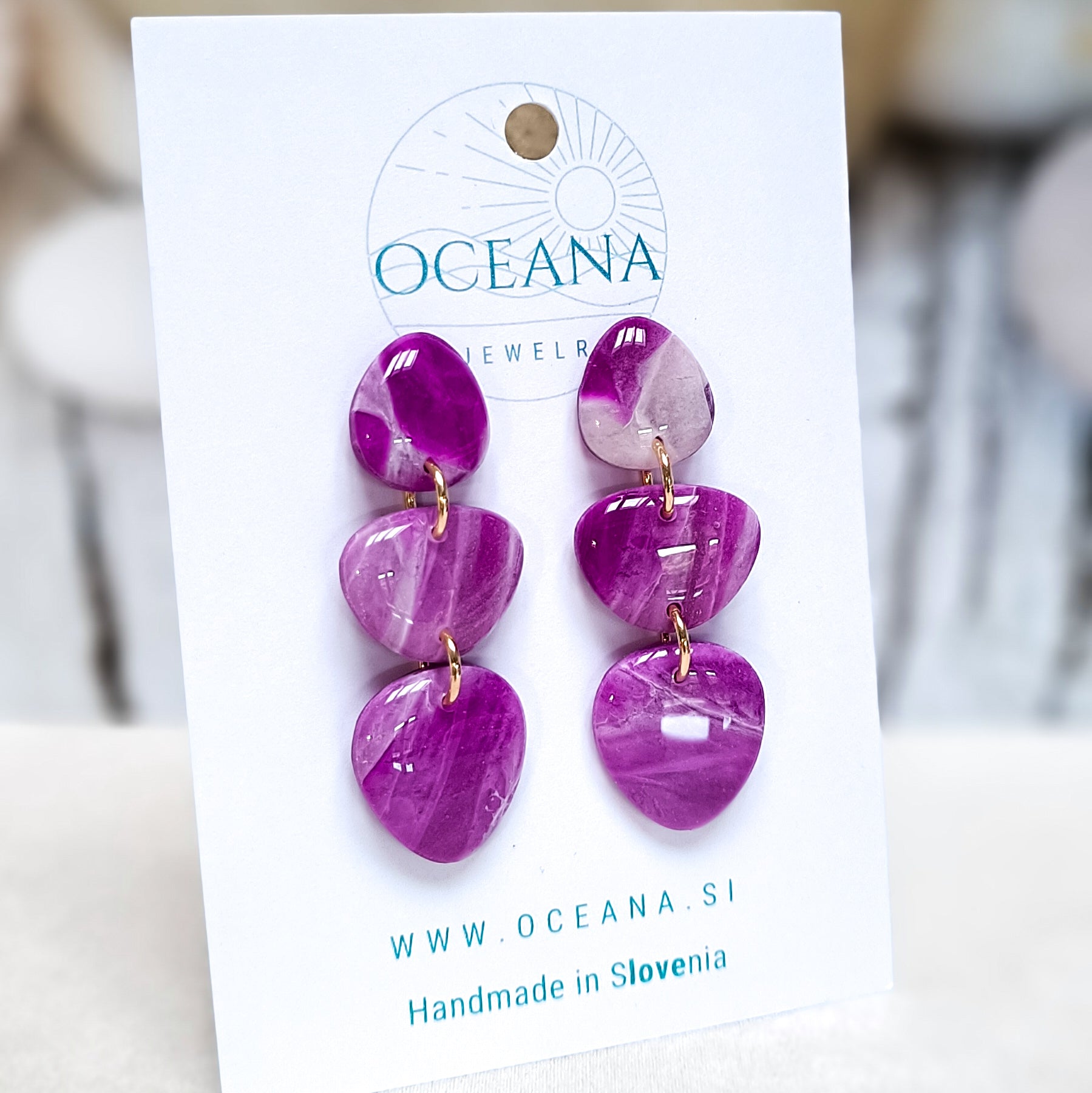Elegantni uhani iz polimerne gline, ki posnemajo lepoto kamna in marmorja. Zaključeni so z gladkim smolnim premazom, material je iz kirurškega jekla in je primeren tudi za občutljiva ušesa. Ti uhani so izredno lahki in zato primerni za celodnevno nošenje.