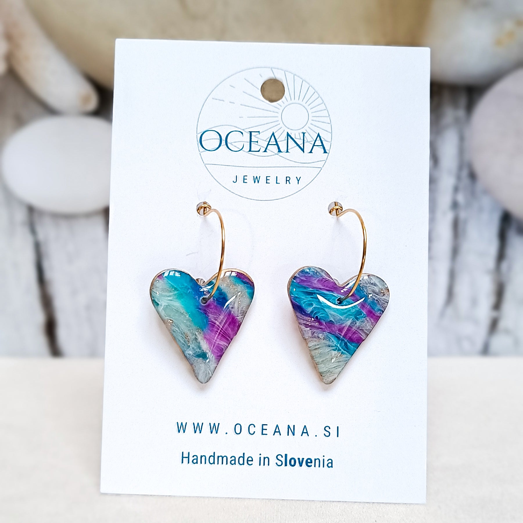 Elegantni uhani iz polimerne gline, ki posnemajo lepoto kamna in marmorja. Zaključeni so z gladkim smolnim premazom, material je iz nerjavečega jekla in je primeren tudi za občutljiva ušesa. Ti uhani so izredno lahki in zato primerni za celodnevno nošenje.