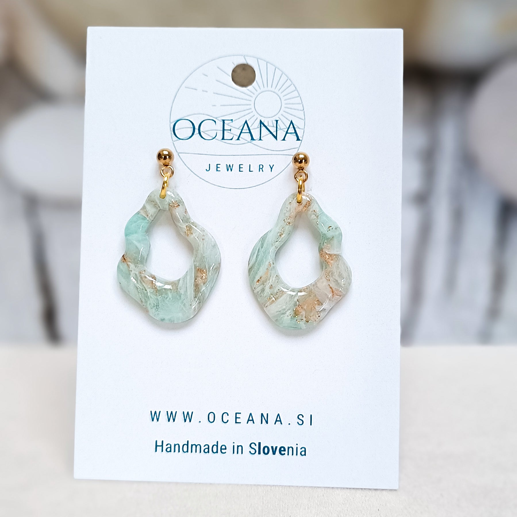 Elegantni uhani iz polimerne gline, ki posnemajo lepoto kamna in marmorja. Zaključeni so z gladkim smolnim premazom, material je iz nerjavečega jekla in je primeren tudi za občutljiva ušesa. Ti uhani so izredno lahki in zato primerni za celodnevno nošenje.