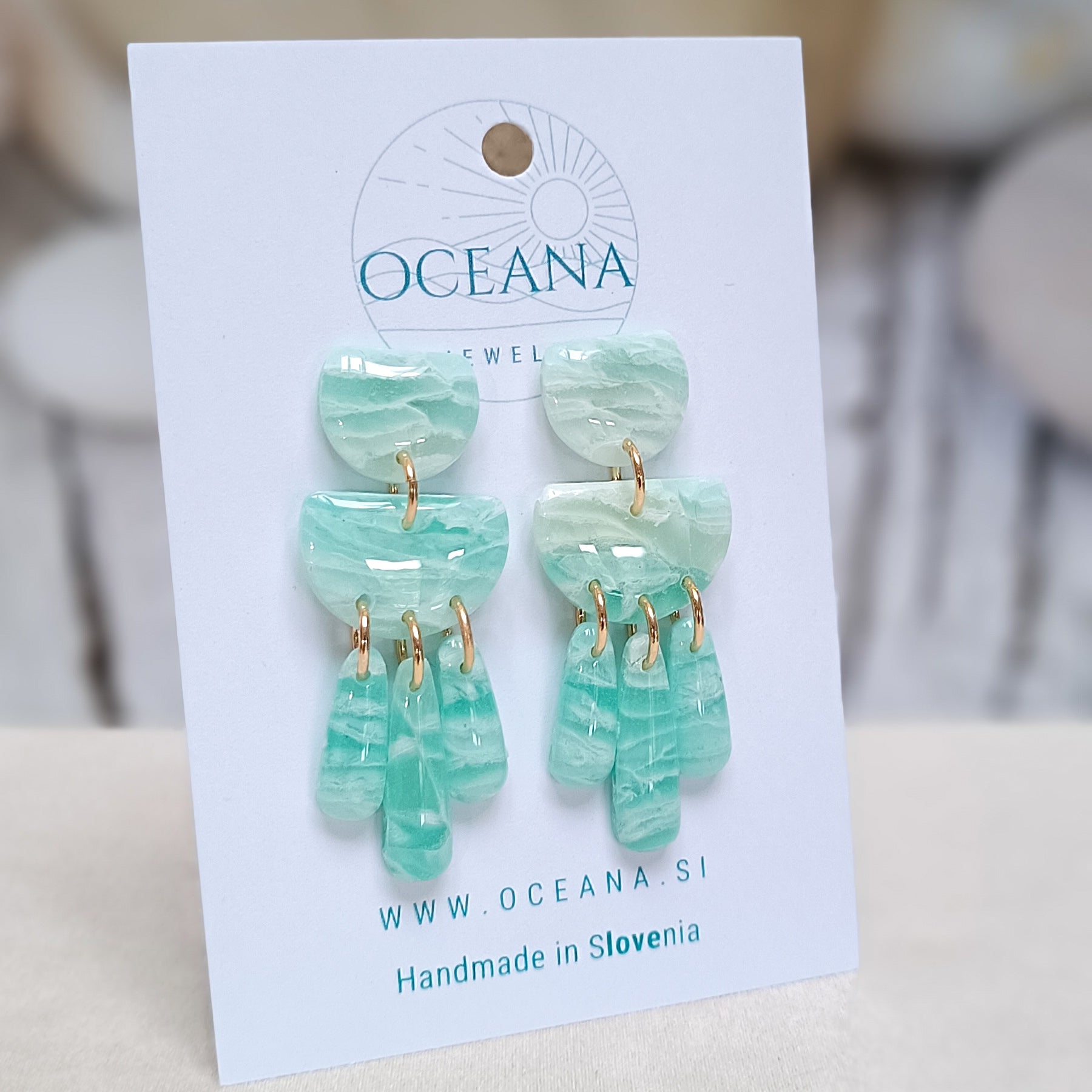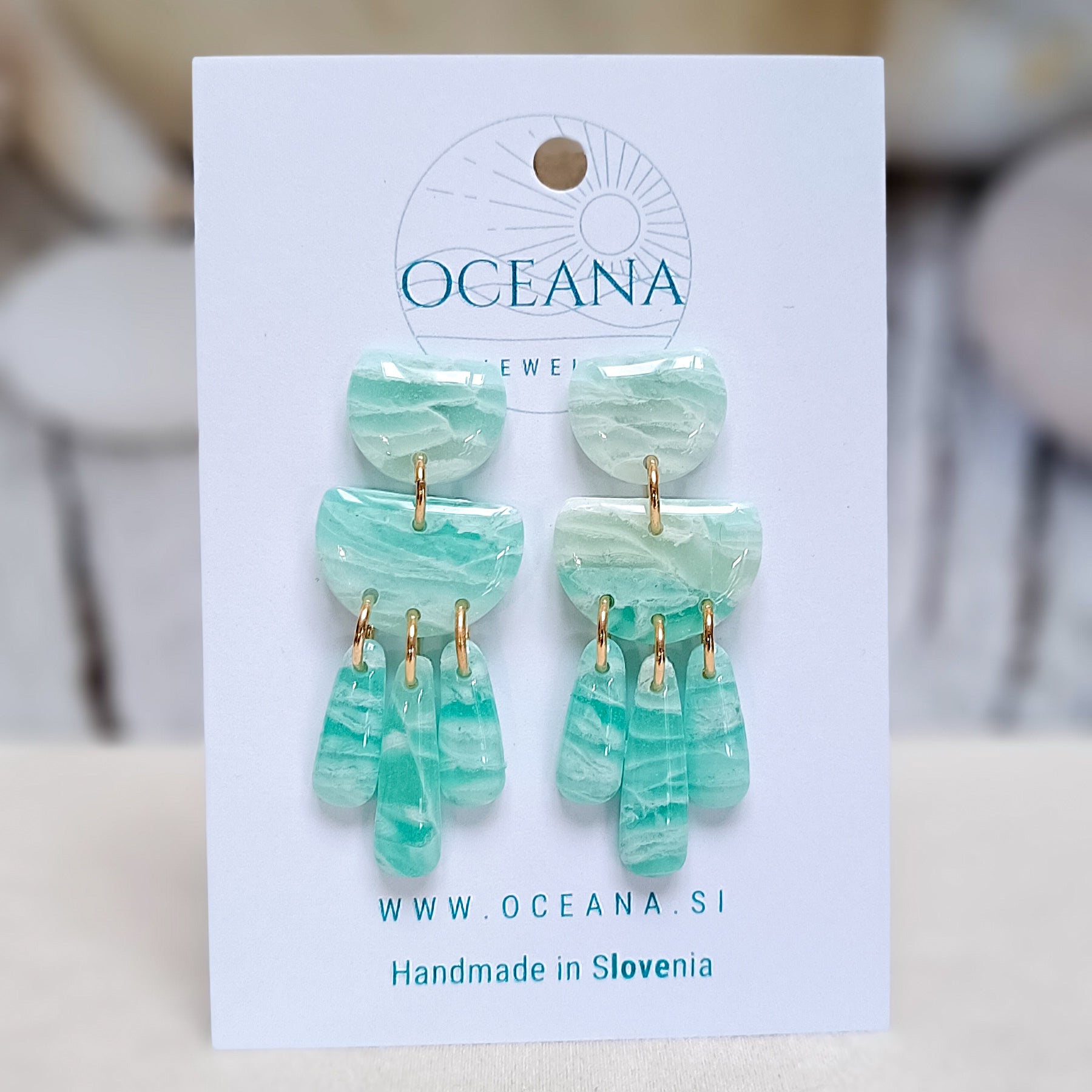 Elegantni uhani iz polimerne gline, ki posnemajo lepoto kamna in marmorja. Zaključeni so z gladkim smolnim premazom, material je iz kirurškega jekla in je primeren tudi za občutljiva ušesa. Ti uhani so izredno lahki in zato primerni za celodnevno nošenje.