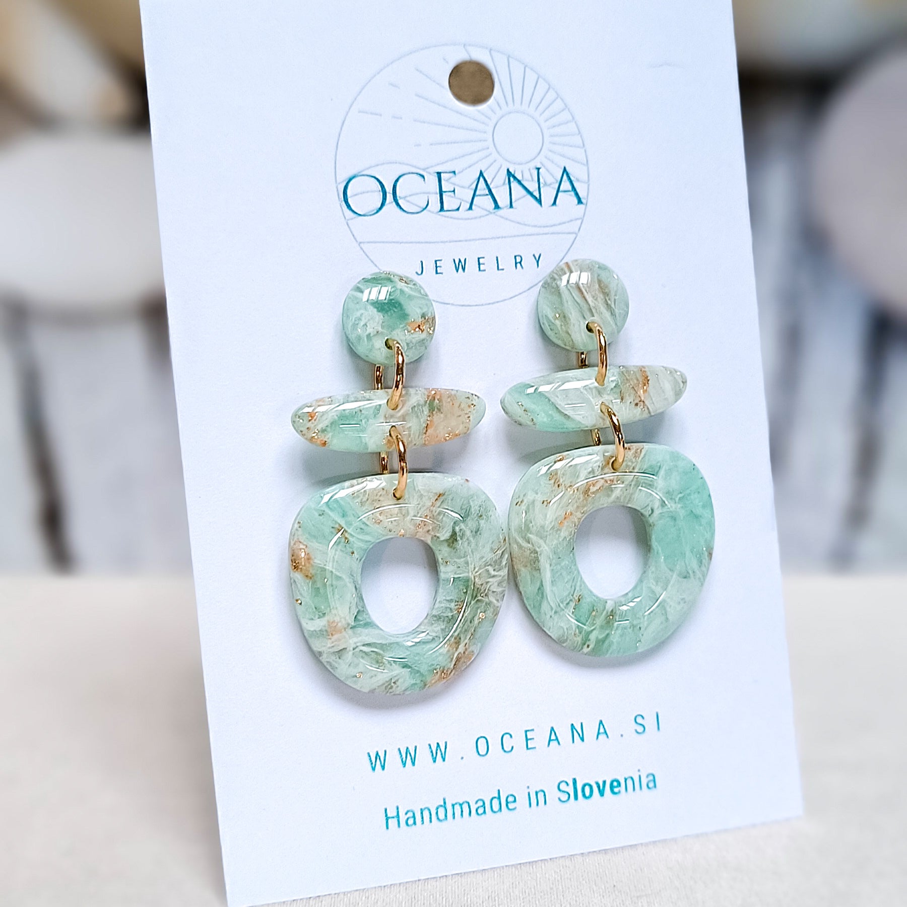 Elegantni uhani iz polimerne gline, ki posnemajo lepoto kamna in marmorja. Zaključeni so z gladkim smolnim premazom, material je iz kirurškega jekla in je primeren tudi za občutljiva ušesa. Ti uhani so izredno lahki in zato primerni za celodnevno nošenje.